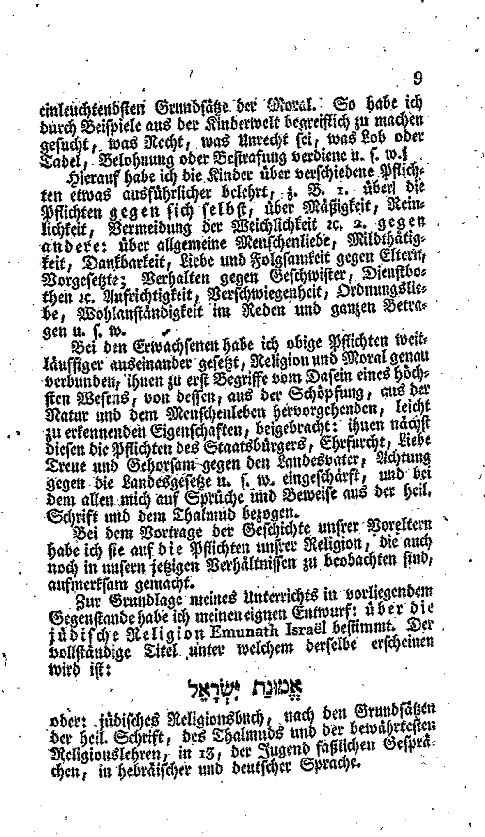 9 einleuchtenbſten Grundſaͤte der Moral. So habe ich durch Beiſpiele aus der Kinderwelt begreiftich zu machen eſacht, was Recht, was Unrecht ſei, was Lob oder Tadel, Belohnung oder Beſtrafung verdiene n. ſ. w.]. Hierauf habe ich die Kinder uͤber verſchiedene Pflich⸗ ten etwas ausfuͤhrlicher belehrt, z. B. 1. uber die Pflichten gegen ſich ſelbſt uͤber Maͤßigkeit, Rein⸗ lichkeit, Vermeidung der Weichlichkeit ꝛc. 2. gegen gudere: uͤber allgemeine Meuſchenliebe, Mildthaͤtig⸗ keit, Dankbarkeit, Aebe und Folgſamkeit gegen Eltern Vorgeſetzte; Verhalten gegen Geſchwiſter, Dienſtbo⸗ then ꝛc. Aufrichtigkeit, Verſchwiegenheit, Ordnungslie⸗ be, Wohlanſtändigkel im Reden und ganzen Betra⸗ gen u.„ w.„. 1.. 2. Bei den Erwachſenen habe ich obige Pflichten weit⸗ Auffiger auseinander geſest, Neligion und Moral genau verbunden, ihnen zu f Begriffe vom Daſein eines hoͤch⸗ ſten Weſens, von deſſen, aus der Schopfung, aus der Natur und dem Menſchenleben hervorgehenuen leicht zu erkennenden Eigenſchaften/ beigebracht: ihnen naͤchſt dieſen die Pflichten des Staatsbuͤrgers, Ehrfürcht, Liehe Treue und Gehorſam gegen den andesbater; Achtung gegen die Landesgeſetze u. ſ. w. eingeſchaͤrft, und bei dem allen mich auf Spruͤche und Beweiſe aus der heil. Schrift und dem Thalmud bezogen. Bei dem Vortrage der Geſchichte unſrer Voreltern habe ich ſie auf die Pflichten unſter Relgion, die auch nooch in unſern jetzigen Verhaͤltniſſen zu beobachten ſind, aufmerkſam gemacht. e. Zur Grundlage meines Unterrichts in vorliegendem Gegenſtande habe ich meinen eignen Entwurf; uͤber die judiſche Neligion Emunath Lsrael beſtimmt. Der vollſtaͤndige Titel unter welchem derſelbe erſcheinen
