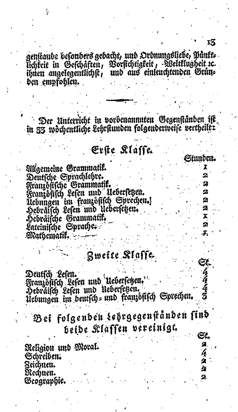 Erſte Kläaſſe. „ Stunden. Allgemeine Grammatik. Deutſche Sprachleher. Franzoͤſiſche Grammatik... Feanzoͤſiſch Leſen und Ueberſeten. Uebungen im franzoͤſiſch Sprechen./. Hebraͤiſch Leſen und Ueberſetzen.. Hebraͤiſche Grammak. Lateiniſche Sprache-eæ Mathematik.