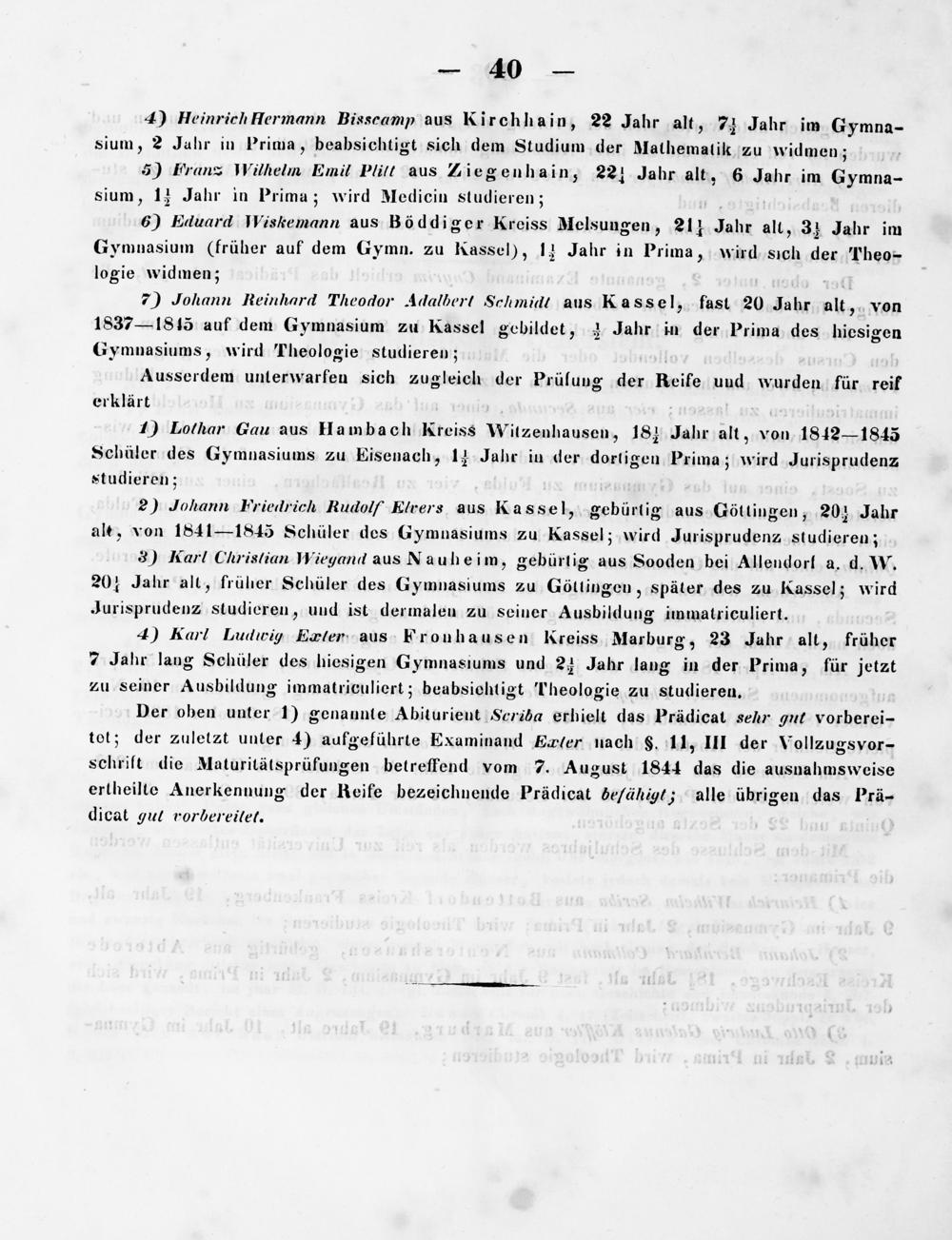 4) Heinrich Hermann Bisscamp aus Kirchhain, 22 Jahr alt, 7 ¾ Jahr im Gymna- sium, 2 Jahr in Prima, beabsichtigt sich dem Studium der Mathematikk zu widmen;