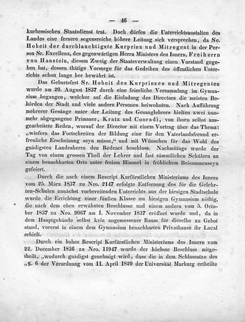 Das Geburtsfest Sr. Hoheit des Kurprinzen und Mitregenten wurde am 20. August 1837 durch eine feierliche Versammlung im Gymna- sium begangen, welcher auf die Einladung des Directors die meisten Be- hörden der Stadt und viele andere Personen beiwohnten. Nach Aufführung mehrerer Gesänge unter der Leitung des Gesanglehrers hielten zwei nun- mehr abgegangene Primaner, Kratz und Conradi, von ihnen selbst aus- gearbeitete Reden, worauf der Director mit eiuem Vortrag über das Thema: „wiefern das Fortschreiten der Bildung eine für den Vaterlandsfreund er- freuliche Erscheinung seyn müsse,“ und mit Wünschen für das Wohl des gnädigsten Landesherrn den Redeact beschloss. Nachmittags wurde der Tag von einem grossen Theil der Lehrer und fast sämmtlichen Schülern an einem benachbarten Orte unter freiem Himmel in fröhlichem Beisammenseyn gefeiert.