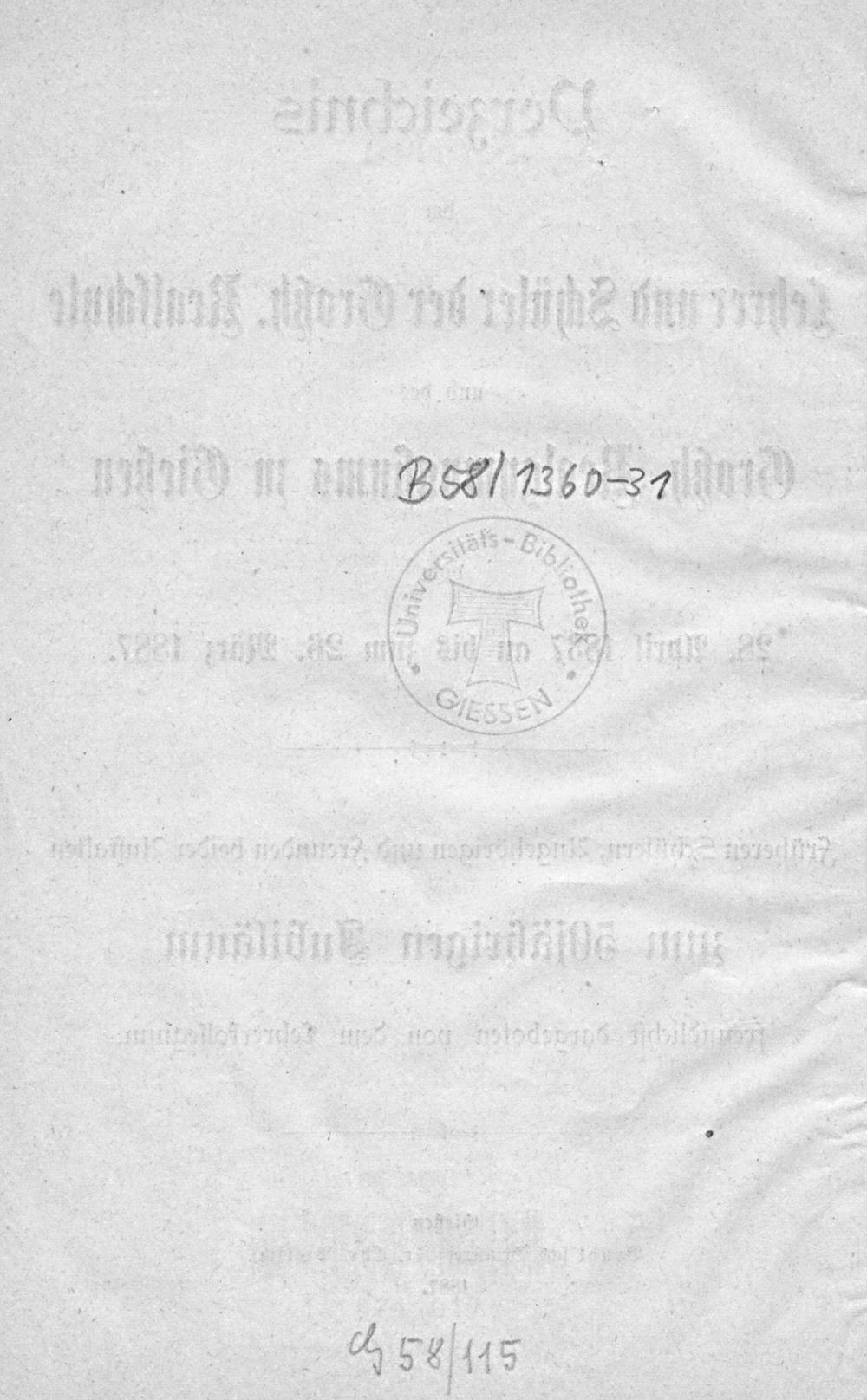 Verzeichnis der Lehrer und Schüler der Großh. Realschule und des Großh. Realgymnasiums zu Gießen vom 28. April 1837 an bis zum 26. März 1887 : früheren Schülern, Angehörigen und Freunden beider Anstalten zum 50jährigen Jubiläum freundlichst dargeboten von dem Lehrerkollegium / [Vorwort:] O. Buchner ...