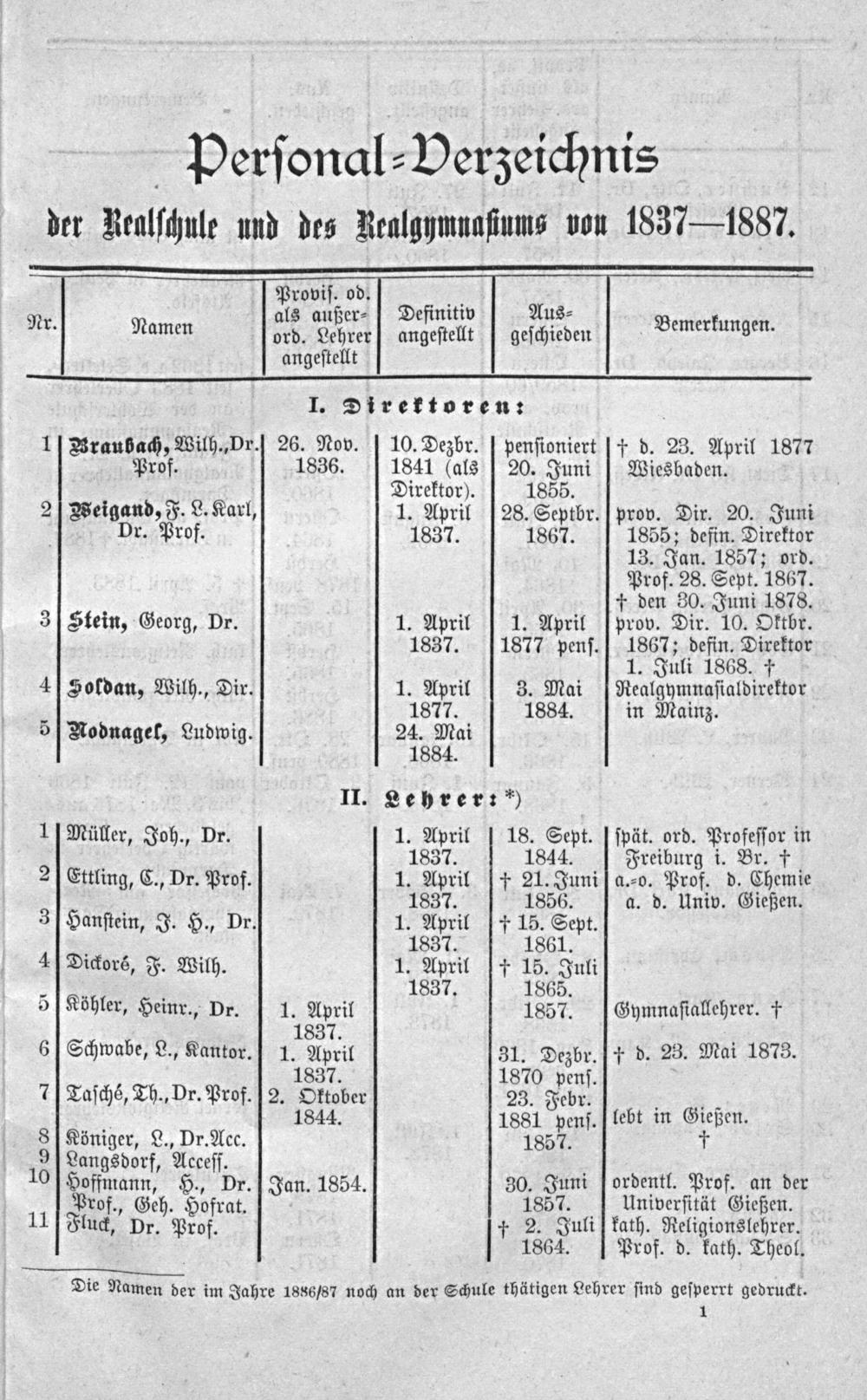 Proviſ. od. Definiti Aas als außer⸗ efinitiv us⸗ Nr Namen ord. uher. angeſtellt geſchieden Bemerkungen. angeſtellt I. Direktoren: 1] Braubach, Wilh.,Dr.] 26. Nov. 10. Dezbr. penſioniert † d. 23. April 1877 Prof. 1836. 1841(als 20. Juni Wiesbaden. Direktor). 1855. 2 Seigand, F. L. Karl, 1. April 28. Septbr. prov. Dir. 20. Juni Dr. Prof. 1837. 1867. 1855; deſin. Direktor 13. Jan. 1857; ord. Prof. 28. Sept. 1867. † den 30. Juni 1878. 3 Stein, Georg, Dr. 1. April ſ 1. April ſprov. Dir. 10. Oktbr. 1837. 1877 penſ. 1867; defin. Direktor 1. Juli 1868. † 4 Joldan, Wilh., Dir. 1. April 3. Mai(Realgymnaſialdirektor 2 1877. 1884. in Mainz. 5 Nodnagel, Ludwig. 24. Mai 1884. II. Lehrer:*) 1 Müller, Joh., Dr. 1. April 18. Sept. ſpät. ord. Profeſſor in 1837. 1844. Freiburg i. Br. † 2(Ettling, C., Dr. Prof. 1. April[† 21. Junia.⸗o. Prof. d. Chemie 1837. 1856. a. d. Univ. Gießen. 3(Hanſtein, J. H., Dr. 1. April † 15. Sept. 1837. 1861. 4(Dickoré, F. Wilh. 1. April[† 15. Juli 1837. 1865. 5(Köhler, Heinr., Dr. 1. April 1857. Gymnaſiallehrer. † 1837. 6(Schwabe, L., Kantor.] 1. April 31. Dezbr. † d. 23. Mai 1873. 1837. 1870 penſ. 7(Taſché, Th., Dr. Prof. 2. Oktober 23. Febr.. 1844. 1881 penſ. lebt in Gießen. 8 Königer, L., Dr. Acc. 1857. † 9 Langsdorf, Acceſſ. 10 Hoffmann, H., Dr. Jan. 1854. 30. Juni ſordentl. Prof. an der Prof., Geh. Hofrat. 1857. Univerſität Gießen. 11(Fluck, Dr. Prof. † 2. Juli kath. Religionslehrer. 1864. Prof. d. kath. Theol.