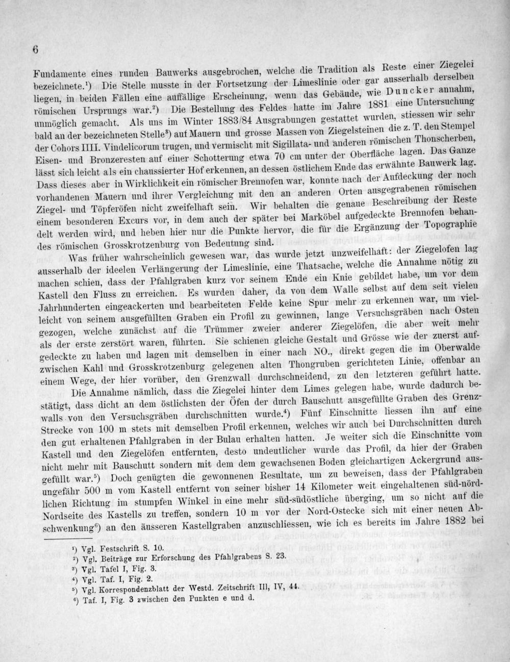 Die Annahme nämlich, dass die Ziegelei hinter dem Limes gelegen habe, wurde dadurch be- stätigt, dass dicht an dem östlichsten der 6fen der durch Bauschutt ausgefüllte Graben des Grenz- walls von den Versuchsgräben durchschnitten wurde.¹) Fünf Einschnitte liessen ihn auf eine Strecke von 100 m stets mit demselben Profil erkennen, welches wir auch bei Durchschnitten durch den gut erhaltenen Pfahlgraben in der Bulau erhalten hatten. Je weiter sich die Einschnitte vom Kastell und den Ziegelöfen entfernten, desto undeutlicher wurde das Profil, da hier der Graben nicht mehr mit Bauschutt sondern mit dem dem gewachsenen Boden gleichartigen Ackergrund aus- gefüllt war.“) Doch genügten die gewonnenen Resultate, um zu beweisen, dass der Pfahlgraben ungefähr 500 m vom Kastell entfernt von seiner bisher 14 Kilometer weit eingehaltenen süd-nörd- lichen Richtung im stumpfen Winkel in eine mehr süd-südöstliche überging, um so nicht auf die Nordseite des Kastells zu treffen, sondern 10 m vor der Nord-Ostecke sich mit einer neuen Ab- schwenkung“) an den äusseren Kastellgraben anzuschliessen, wie ich es bereits im Jahre 1882 bei