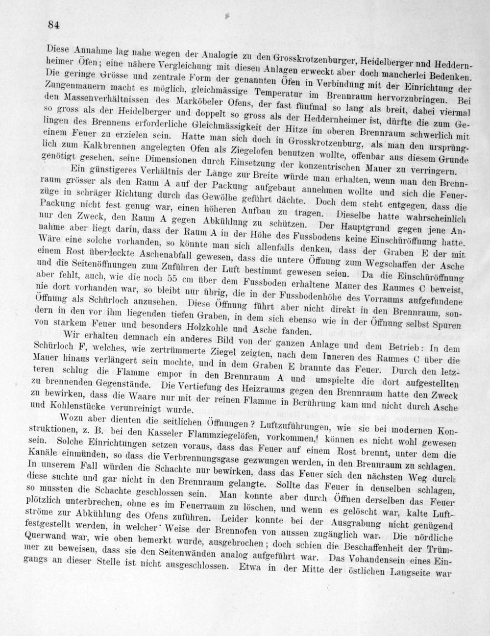 Ein günstigeres Verhältnis der Länge zur Breite würde man erhalten, wenn man den Brenn- raum grösser als den Raum A auf der Packung aufgebaut annehmen wollte und sich die Feuer- züge in schräger Richtung durch das Gewölbe geführt dächte. Doch dem steht entgegen, dass die Packung nicht fest genug war, einen höheren Aufbau zu tragen. Dieselbe hatte wahrscheinlich nur den Zweck, den Raum A gegen Abkühlung zu schützen. Der Hauptgrund gegen jene An- nahme aber liegt darin, dass der Raum A in der Höhe des Fussbodens keine Einschüröffnung hatte. Wäre eine solche vorhanden, so könnte man sich allenfalls denken, dass der Graben E der mit, einem Rost überdeckte Aschenabfall gewesen, dass die untere Öffnung zum Wegschaffen der Asche und die Seitenöffnungen zum Zuführen der Luft bestimmt gewesen seien. Da die Einschüröffnung aber fehlt, auch, wie die noch 55 cm über dem Fussboden erhaltene Mauer des Raumes C beweist, nie dort vorhanden war, so bleibt nur übrig, die in der Fussbodenhöhe des Vorraums aufgefundene Offnung als Schürloch anzusehen. Diese Öffnung führt aber nicht direkt in den Brennraum, son- dern in den vor ihm liegenden tiefen Graben, in dem sich ebenso wie in der Öffnung selbst Spuren von starkem Feuer und besonders Holzkohle und Asche fanden.