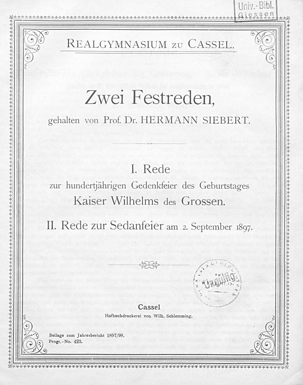 Zwei Festreden, gehalten von Prof. Dr. HERMANN SIEBERT.