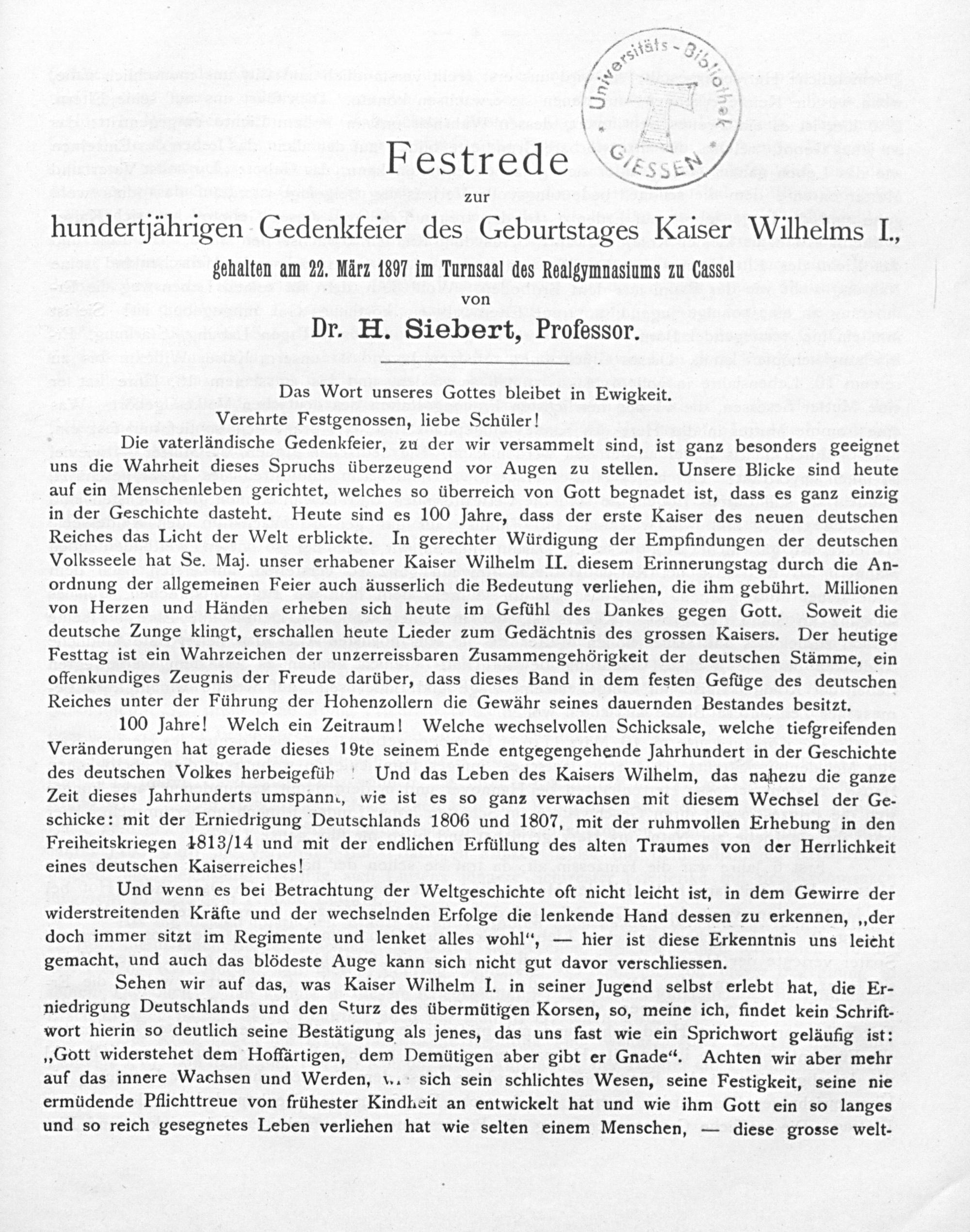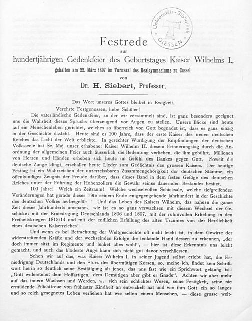Die vaterländische Gedenkfeier, zu der wir versammelt sind, ist ganz besonders geeignet uns die Wahrheit dieses Spruchs überzeugend vor Augen zu stellen. Unsere Blicke sind heute auf ein Menschenleben gerichtet, welches so überreich von Gott begnadet ist, dass es ganz einzig in der Geschichte dasteht. Heute sind es 100 Jahre, dass der erste Kaiser des neuen deutschen Reiches das Licht der Welt erblickte. In gerechter Würdigung der Empfindungen der deutschen Volksseele hat Se. Maj. unser erhabener Kaiser Wilhelm II. diesem Erinnerungstag durch die An- ordnung der allgemeinen Feier auch äusserlich die Bedeutung verliehen, die ihm gebührt. Millionen von Herzen und Händen erheben sich heute im Gefühl des Dankes gegen Gott. Soweit die deutsche Zunge klingt, erschallen heute Lieder zum Gedächtnis des grossen Kaisers. Der heutige Festtag ist ein Wahrzeichen der unzerreissbaren Zusammengehörigkeit der deutschen Stämme, ein offenkundiges Zeugnis der Freude darüber, dass dieses Band in dem festen Gefüge des deutschen Reiches unter der Führung der Hohenzollern die Gewähr seines dauernden Bestandes besitzt.