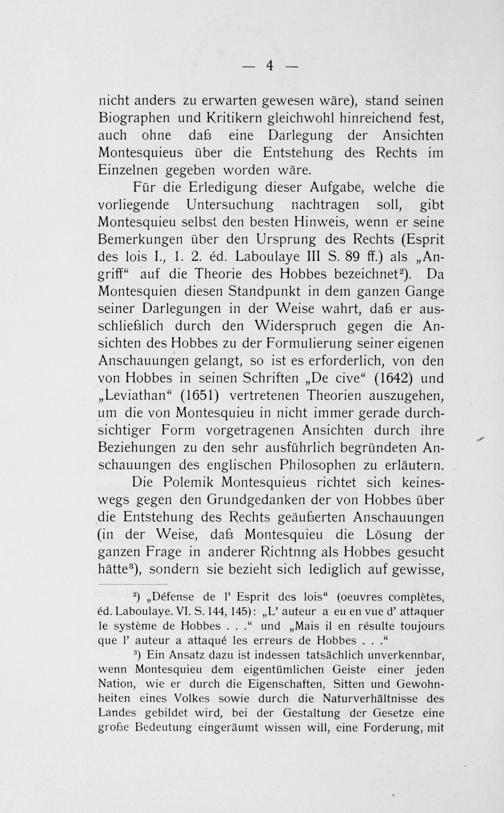 Für die Erledigung dieser Aufgabe, welche die vorliegende Untersuchung nachtragen soll, gibt Montesquieu selbst den besten Hinweis, wenn er seine Bemerkungen über den Ursprung des Rechts(Esprit des lois I., 1. 2. éd. Laboulaye III S. 89 ff.) als„An- griff“ auf die Theorie des Hobbes bezeichnet²). Da Montesquien diesen Standpunkt in dem ganzen Gange seiner Darlegungen in der Weise wahrt, daß er aus— schließlich durch den Widerspruch gegen die An— sichten des Hobbes zu der Formulierung seiner eigenen Anschauungen gelangt, so ist es erforderlich, von den von Hobbes in seinen Schriften„De cive“(1642) und „Leviathan“(1651) vertretenen Theorien auszugehen, um die von Montesquieu in nicht immer gerade durch-— sichtiger Form vorgetragenen Ansichten durch ihre Beziehungen zu den sehr ausführlich begründeten An— schauungen des englischen Philosophen zu erläutern.