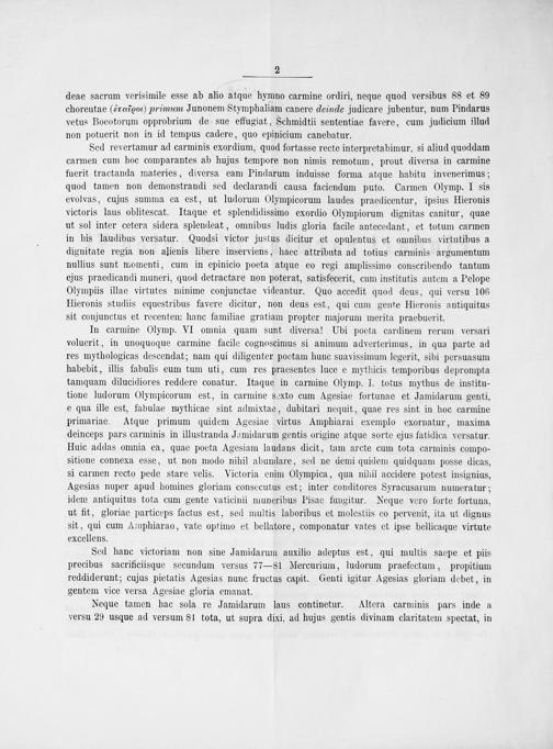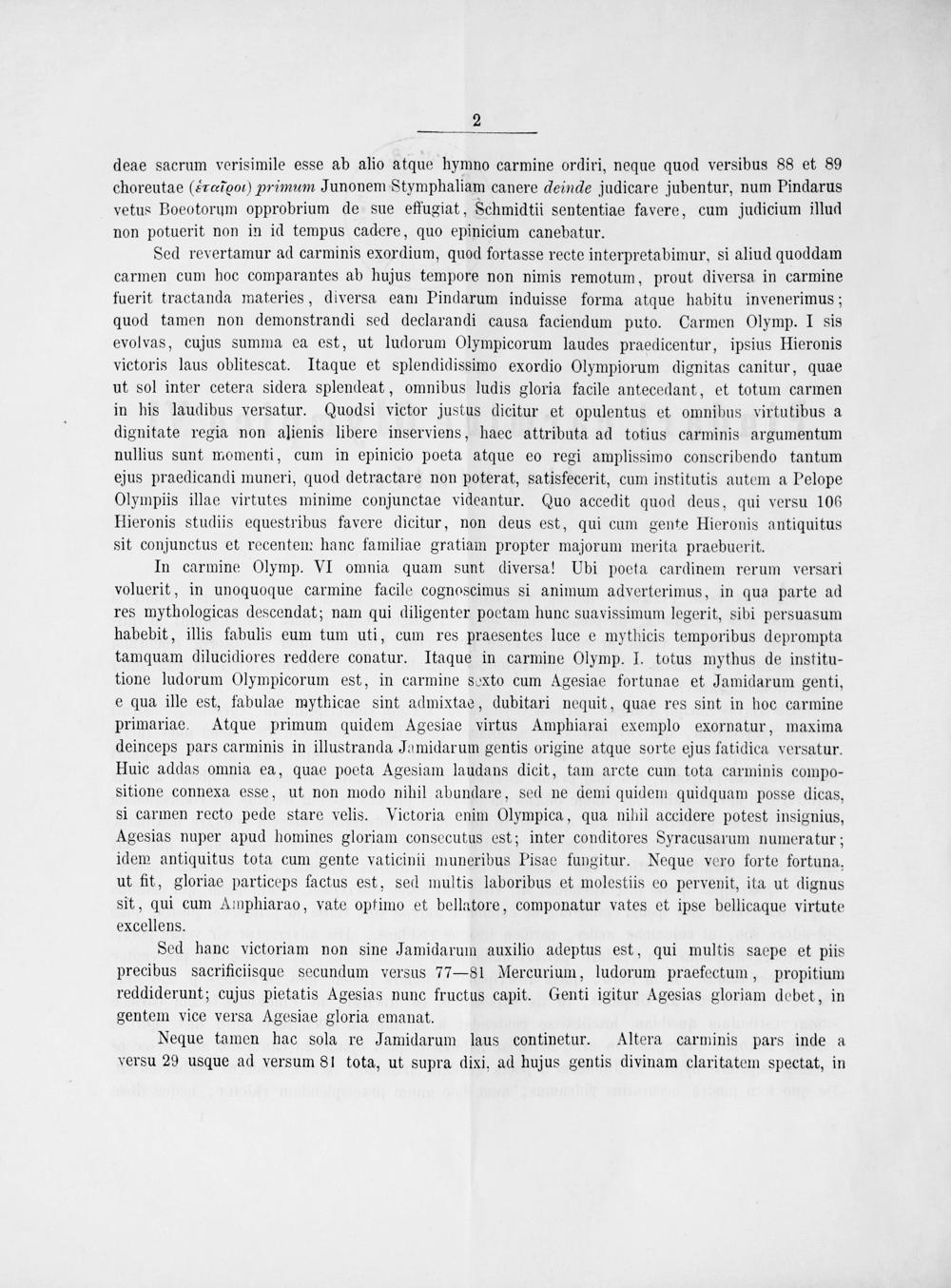 In carmine Olymp. VI omnia quam sunt diversa! Ubi pocta cardinem rerum versari voluerit, in unoquoque carmine facile cognoscimus si animum adverterimus, in qua parte ad res mythologicas descendat; nam qui diligenter poetam hunc suavissimum legerit, sibi persuasum habebit, illis fabulis eum tum uti, cum res praesentes luce e mythicis temporibus deprompta tamquam dilucidiores reddere conatur. Itaque in carmine Olymp. I. totus mythus de institu- tione ludorum Olympicorum est, in carmine sexto cum Agesiae fortunae et Jamidarum genti, e qua ille est, fabulae mythicae sint admixtae, dubitari nequit, quae res sint in hoc carmine primariae. Atque primum quidem Agesiae virtus Amphiarai exemplo exornatur, maxima deinceps pars carminis in illustranda Jamidarum gentis origine atque sorte ejus fatidica versatur. Huic addas omnia ea, quae poeta Agesiam laudans dicit, tam arcte cum tota carminis compo- sitione connexa esse, ut non modo nihil abundare, sed ne demi quidem quidquam posse dicas, si carmen recto pede stare velis. Victoria enim Olympica, qua nihil accidere potest insignius, Agesias nuper apud homines gloriam consecutus est; inter conditores Syracusarum numeratur; idem antiquitus tota cum gente vaticinii muneribus Pisae fungitur. Neque vero forte fortuna, ut fit, gloriae particeps factus est, sed multis laboribus et molestiis eo pervenit, ita ut dignus sit, qui cum Amphiarao, vate optimo et bellatore, componatur vates et ipse bellicaque virtute excellens.