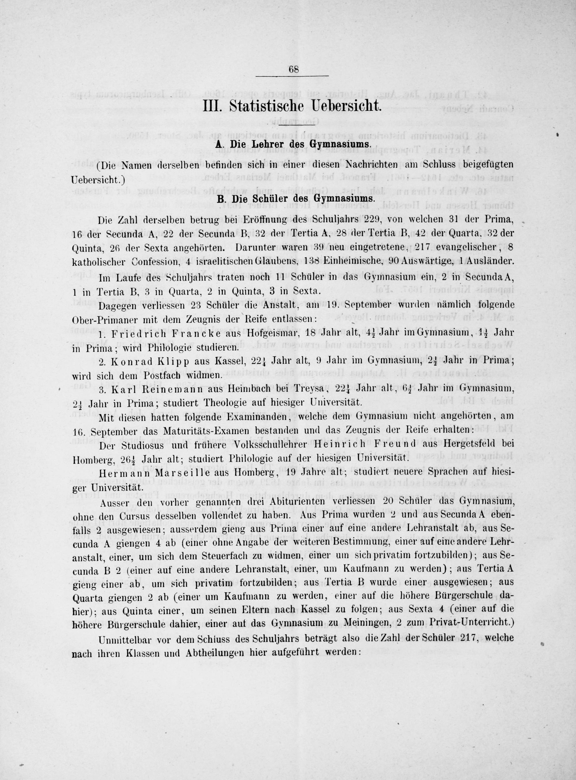 Ausser den vorher genannten drei Abiturienten verliessen 20 Schüler das Gymnasium, ohne den Cursus desselben vollendet zu haben. Aus Prima wurden 2 und aus Secunda A eben- falls 2 ausgewiesen; ausserdem gieng aus Prima einer auf eine andere Lehranstalt ab, aus Se- cunda A giengen 4 ab(einer ohne Angabe der weiteren Bestimmung, einer auf eine andere Lehr- anstalt, einer, um sich dem Steuerfach zu widmen, einer um sich privatim fortzubilden); aus Se- cunda B 2(einer auf eine andere Lehranstalt, einer, um Kaufmann zu werden); aus Tertia A gieng einer ab, um sich privatim fortzubilden; aus Tertia B wurde einer ausgewiesen; aus Quarta giengen 2 ab(einer um Kaufmann zu werden, einer auf die höhere Bürgerschule da- hier); aus Quinta einer, um seinen Eltern nach Kassel zu folgen; aus Sexta 4(einer auf die höhere Bürgerschule dahier, einer aut das Gymnasium zu Meiningen, 2 zum Privat-Unterricht.)