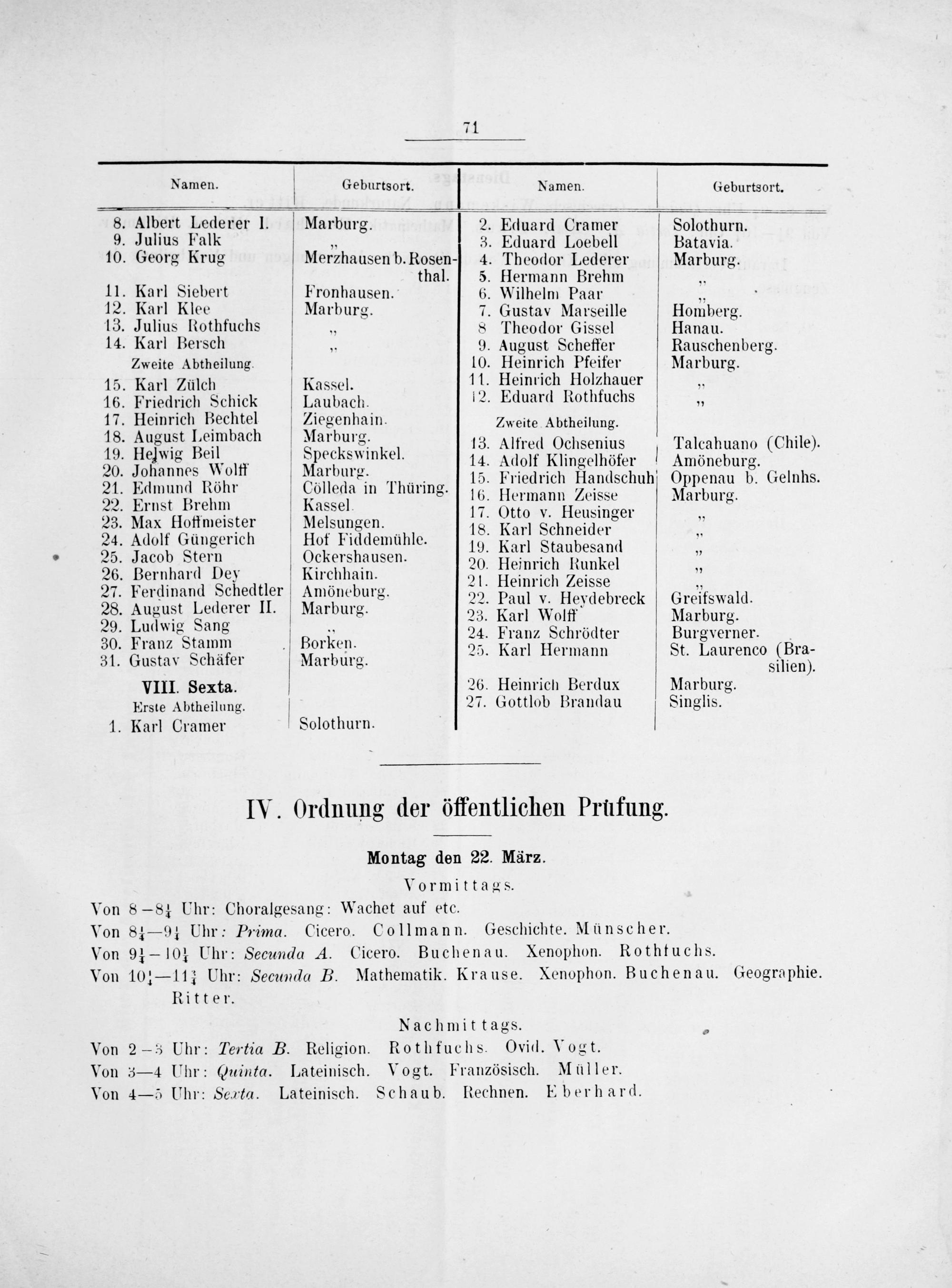 Namen. V Geburtsort. Namen. V Geburtsort. 3 Albeit Lorer I. Marburg. 2. uard raner Solothunn. 9. Julius Falk 5 3. Eduard Loebe Batavia. 10. Georg Krug Merzhausen d osrn 4. Theodor Lederer Marburg. thal. 5. Hermann Brehm 11. Karl Siebert Fronhausen. 6. Wilhelm Paar„ 12. Karl Klee Marburg. 7. Gustav Marseille Homberg. 13. Julius Rothfuchs 8 Theodor Gissel Hanau. 14. Karl Bersch— 9. August Scheffer Rauschenberg. Zweite Abtheilung. 10. Heinrich Pfeifer Marburg. 15. Karl Zülch Kassel. 11. Heinrich Holzhauer 8 16. Friedrich Schick Laubach. 12. Eduard Rothfuchs„ 17. Heinrich Bechtel V Ziegenhain. Zweite Abtheilung. 18 Hufue Keimbacn lehe Fgeg 13. Alfred Ochsenius Talcahuano(Chile). 20. Huongen Wwolff Nlarhend 14. Adolf Klingelhöfer Amöneburg. r r 15. Friedrich Handschuhſ Oppenau b. Gelnhs. 21. Edmund Röhn Cölleda in Thüring. 16 Hler Leisse Marburg 22. Ernst Brehm Kassel 17 Cleeensne 4155.. Marhutg. 23. Max fHoffmeister Melsungen. 18. Kan Nneden 24. Adolf Güngerich Hof Fiddemühle. r Karl Senmelden 3. 19. Karl Staubesand 25. Jacob Stern Ockershausen. 20. Heinrich Runkel 3, 26. Bernhard Dey Kirchhain. 2L Kiemrien Zait he„ 7. Ferdinand Schedtler Amöneburg. 22 P Cn olsse 4 d 22. Paul v. Heydebreck Greifswald. 28. August Lederer II. Marburg. 23. Karl Wolff 29. Ludwig Sang 23. Karl Wolff Marburg. 30 Franz Stamm Rorigen 24. Fran⸗z Schrödter Burgverner. 31. Gustav Schäfer Marburg 25. Karl Hermann St. Laurenco U 31. Gustav S 8. silien). VIII. Sexta. 26. Heinrich Berdux Marburg. Erste Abtheilung. 27. Gottlob Brandau Singlis. 1. Karl Cramer Solothurn. V IV. Ordnung der öffentlichen Prüͤfung. 118 Montag den 22. März. Vormittags. Von 8— 8 ¼ Uhr: Choralgesang: Wachet auf etc. Von 8 ¼— 9 ¼ Uhr: Prima. Cicero. Collmann. Geschichte. Münscher. Von 9 ¼— 10 ¼ Uhr: Secunda A. Cicero. Buchenau. Xenophon. Rothtuchs. Von 10— 11 ¾ Uhr: Secunda B. Mathematik. Krause. Xenophon. Buchenau. Geographie. Ritter. Nachmittags.„ Von 2—5 Uhr: Tertia B. Religion. Rothfuchs. Ovid. Vogt. Von 3—4 Uhr: Cuinta. Lateinisch. Vogt. Französisch. Müller. Von 4— 5 Uhr: Serta. Lateinisch. Schaub. Rechnen. Eberhard.
