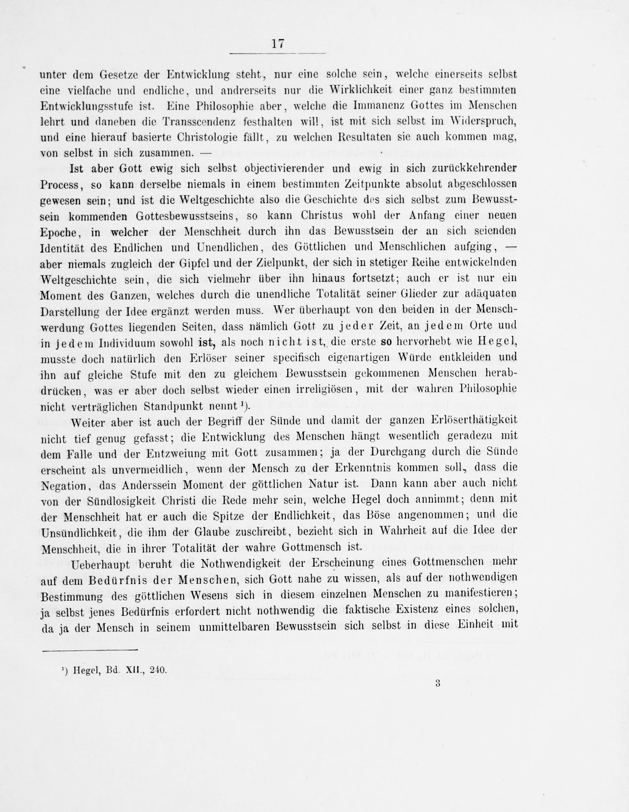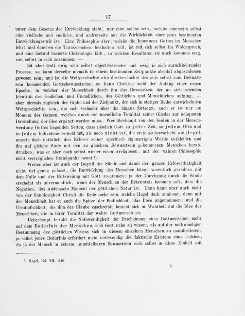 17 unter dem Gesetze der Entwicklung steht, nur eine solche sein, welche einerseits selbst eine vielfache und endliche, und andrerseits nur die Wirklichkeit einer ganz bestimmten Entwicklungsstufe ist. Eine Philosophie aber, welche die Immanenz Gottes im Menschen lehrt und daneben die Transscendenz festhalten will, ist mit sich selbst im Widerspruch, und eine hierauf basierte Christologie fällt, zu welchen Resultaten sie auch kommen mag, von selbst in sich zusammen.—