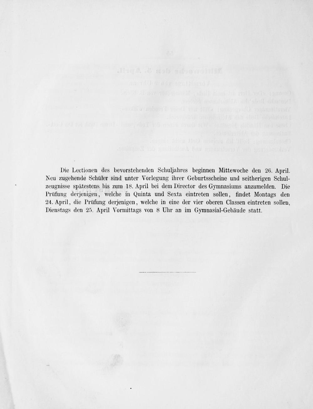 Die Lectionen des bevorstehenden Schuljahres beginnen Mittewoche den 26. April. Neu zugehende Schüler sind unter Vorlegung ihrer Geburtsscheine und seitherigen Schul- zeugnisse spätestens bis zum 18. April bei dem Director des Gymnasiums anzumelden. Die Prüfung derjenigen, welche in Quinta und Sexta eintreten sollen, findet Montags den 24. April, die Prüfung derjenigen, welche in eine der vier oberen Classen eintreten sollen, Dienstags den 25. April Vormittags von 8 Uhr an im Gymnasial-Gebäude statt.