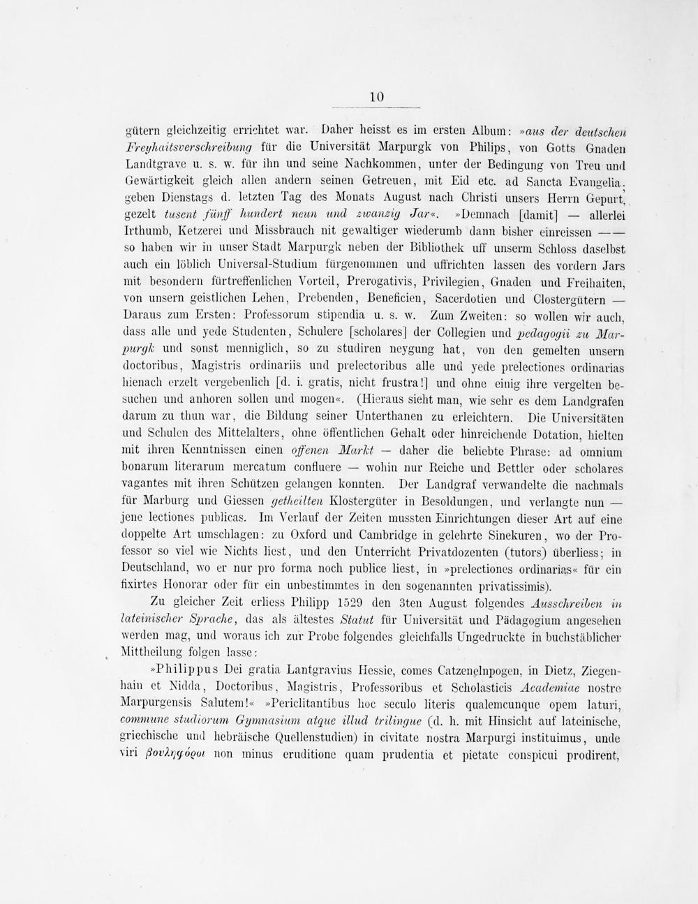 gütern gleichzeitig errichtet war. Daher heisst es im ersten Album:»aæus der deutschen Freuhaitsverschreibung für die Universität Marpurgk von Philips, von Gotts Gnaden Landtgrave u. s. w. für ihn und seine Nachkommen, unter der Bedingung von Treu und Gewärtigkeit gleich allen andern seinen Getreuen, mit Eid etc. ad Sancta Evangelia. geben Dienstags d. letzten Tag des Monats August nach Christi unsers Herrn Gepurt, gezelt tusent fünff hundert neunm und ubanzig Jar«.»Demnach(damit]— allerlei Irthumb, Ketzerei und Missbrauch nit gewaltiger wiederumb dann bisher einreissen—— so haben wir in unser Stadt Marpurgk neben der Bibliothek uff unserm Schloss daselbst auch ein löblich Universal-Studium fürgenommen und uffrichten lassen des vordern Jars mit besondern fürtreffenlichen Vorteil, Prerogativis, Privilegien, Gnaden und Freihaiten, von unsern geistlichen Lehen, Prebenden, Beneficien, Sacerdotien und Clostergütern— Daraus zum Ersten: Professorum stipendia u. s. W. Zum Zweiten: so wollen wir auch, dass alle und yede Studenten, Schulere[scholares] der Collegien und pedlagogii 2zu Mar- purgk und sonst menniglich, so zu studiren neygung hat, von den gemelten unsern doctoribus, Magistris ordinariis und prelectoribus alle und yede prelectiones ordinarias hienach erzelt vergebenlich Id. i. gratis, nicht frustra!] und ohne einig ihre vergelten be- suchen und anhoren sollen und mogen«.(Hieraus sieht man, wie sehr es dem Landgrafen darum zu thun war, die Bildung seiner Unterthanen zu erleichtern. Die Universitäten und Schulen des Mittelalters, ohne öffentlichen Gehalt oder hinrcichende Dotation, hielten mit ihren Kenntnissen einen offenen Markt— daher die beliebte Phrase: ad omnium bonarum literarum mercatum confluere— wohin nur Reiche und Bettler oder scholares vagantes mit ihren Schützen gelangen konnten. Der Landgraf verwandelte die nachmals für Marburg und Giessen getheilten Klostergüter in Besoldungen, und verlangte nun— jene lectiones publicas. Im Verlauf der Zeiten mussten Einrichtungen dieser Art auf eine doppelte Art umschlagen: zu Oxford und Cambridge in gelehrte Sinekuren, wo der Pro- fessor so viel wie Nichts liest, und den ÜUnterricht Privatdozenten(tutors) überliess; in Deutschland, wo er nur pro forma noch publice liest, in ⸗prelectiones ordinarias« für ein fixirtes Honorar oder für ein unbestimmtes in den sogenannten privatissimis).