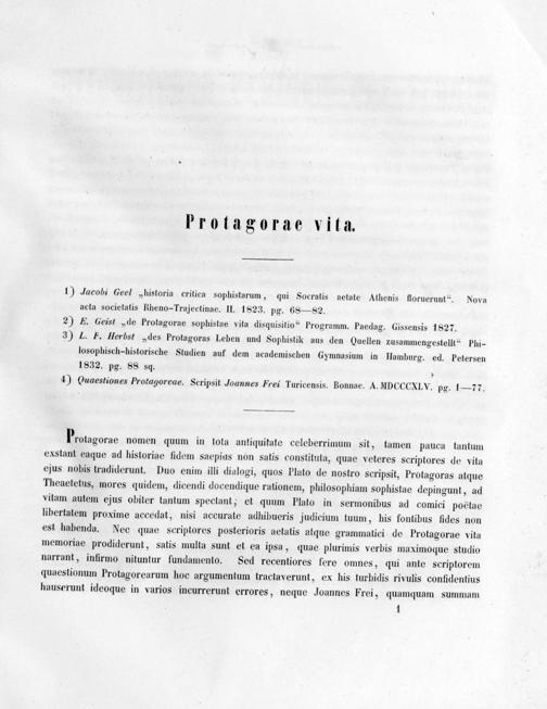 3) L. F. Herbst„des Protagoras Leben und Sophistik aus den Quellen zusammengestellt“ Phi- losophisch-historische Studien auf dem academischen Gymnasium in Hamburg. ed. Petersen 1832. pg. 88 sq.—