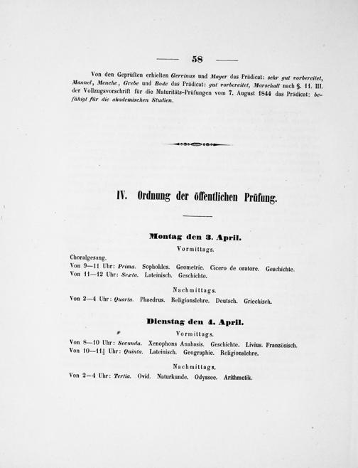 Von den Geprüften erhielten Gerrinus und Mayer das Prädicat: sehr gut vorbereilet, Mannel, Menche, Grebe und Bode das Prädicat: gut vorbereitel, Marschall nach§. 11. III. der Vollzugsvorschrift für die Maturitäts-Prüfungen vom 7. August 1844 das Prädicat: be- fähigt für die akademischen Studien.
