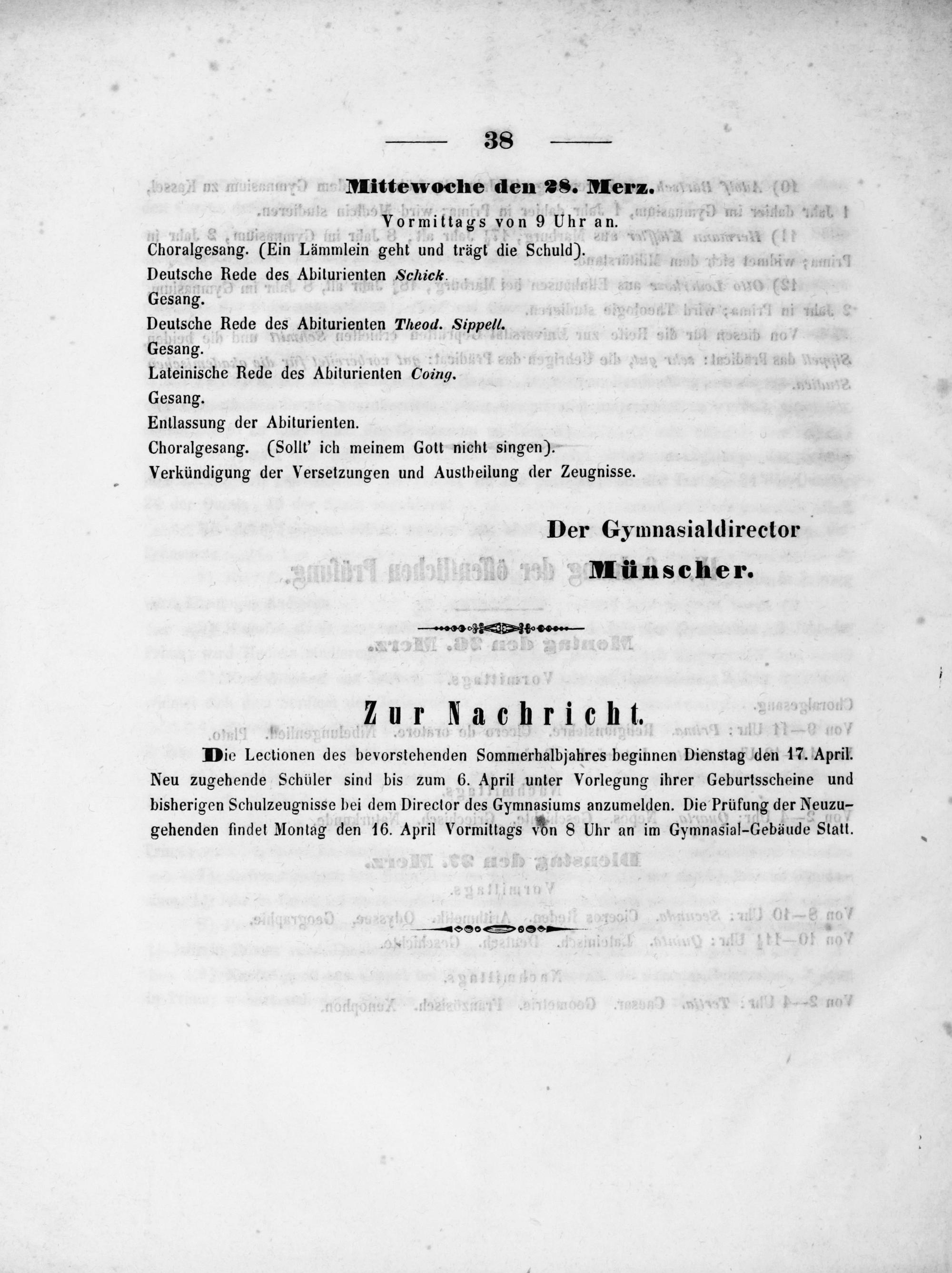 Vormittags von 9 Uhr an. Choralgesang.(Ein Lämmlein geht und trägt die Schuld). Deutsche Rede des Abiturienten Schick. Gesang. Deutsche Rede des Abiturienten Theod. Sippell. Gesang. Lateinische Rede des Abiturienten Coing. Gesang. Entlassung der Abiturienten. Choralgesang.(Sollt' ich meinem Gott nicht singen). Verkündigung der Versetzungen und Austheilung der Zeugnisse.