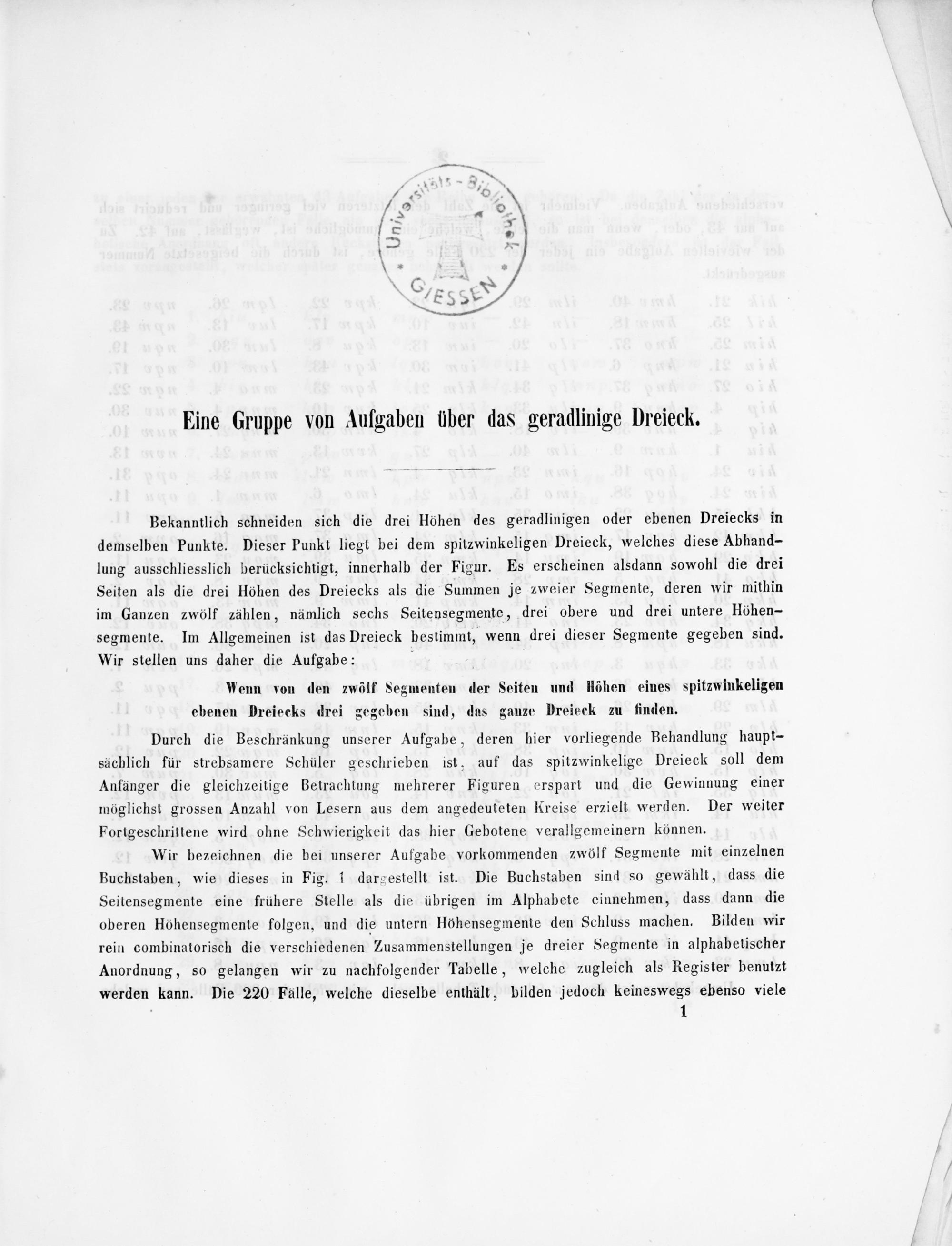 Bekanntlich schneiden sich die drei Höhen des geradlinigen oder ebenen Dreiecks in demselben Punkte. Dieser Punkt liegt bei dem spitzwinkeligen Dreieck, welches diese Abhand- lung ausschliesslich berücksichtigt, innerhalb der Figur. Es erscheinen alsdann sowohl die drei Seiten als die drei Höhen des Dreiecks als die Summen je zweier Segmente, deren wir mithin im Ganzen zwölf zählen, nämlich sechs Seitensegmente, drei obere und drei untere Höhen- segmente. Im Allgemeinen ist das Dreieck bestimmt, wenn drei dieser Segmente gegeben sind. Wir stellen uns daher die Aufgabe: