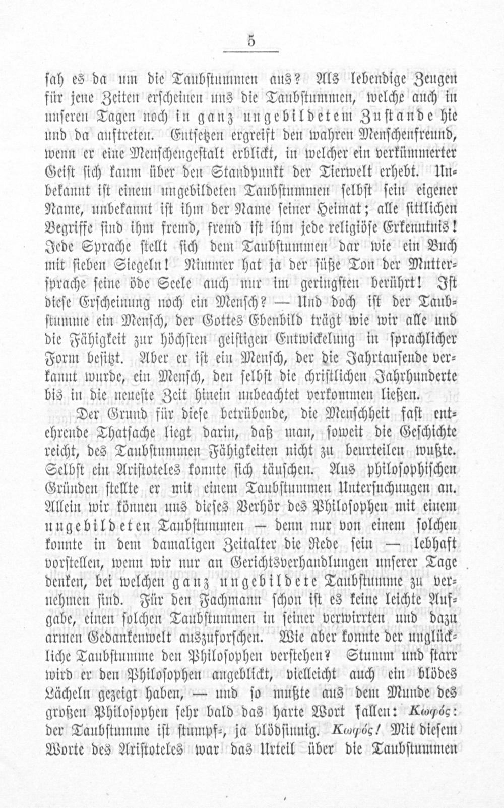 Der Grund für dieſe betrübende, die Menſchheit faſt ent⸗ ehrende Thatſache liegt darin, daß man, ſoweit die Geſchichte reicht, des Taubſtummen Fähigkeiten nicht zu beurteilen wußte. Selbſt ein Ariſtoteles konnte ſich täuſchen. Aus philoſophiſchen Gründen ſtellte er mit einem Taubſtummen Unterſuchungen an. Allein wir können uns dieſes Verhör des Philoſophen mit einem ungebildeten Taubſtummen— denn nur von einem ſolchen konnte in dem damaligen Zeitalter die Rede ſein— lebhaft vorſtellen, wenn wir nur an Gerichtsverhandlungen unſerer Tage denken, bei welchen ganz ungebildete Taubſtumme zu ver⸗ nehmen ſind. Für den Fachmann ſchon iſt es keine leichte Auf⸗ gabe, einen ſolchen Taubſtummen in ſeiner verwirrten und dazu armen Gedankenwelt auszuforſchen. Wie aber konnte der unglück⸗ liche Taubſtumme den Philoſophen verſtehen? Stumm und ſtarr wird er den Philoſophen angeblickt, vielleicht auch ein blödes Lächeln gezeigt haben,— und ſo mußte aus dem Munde des großen Philoſophen ſehr bald das harte Wort fallen: KHοs: der Taubſtumme iſt ſtumpf⸗, ja blödſinnig. Kο/ Mit dieſem Worte des Ariſtoteles war das Urteil über die Taubſtummen