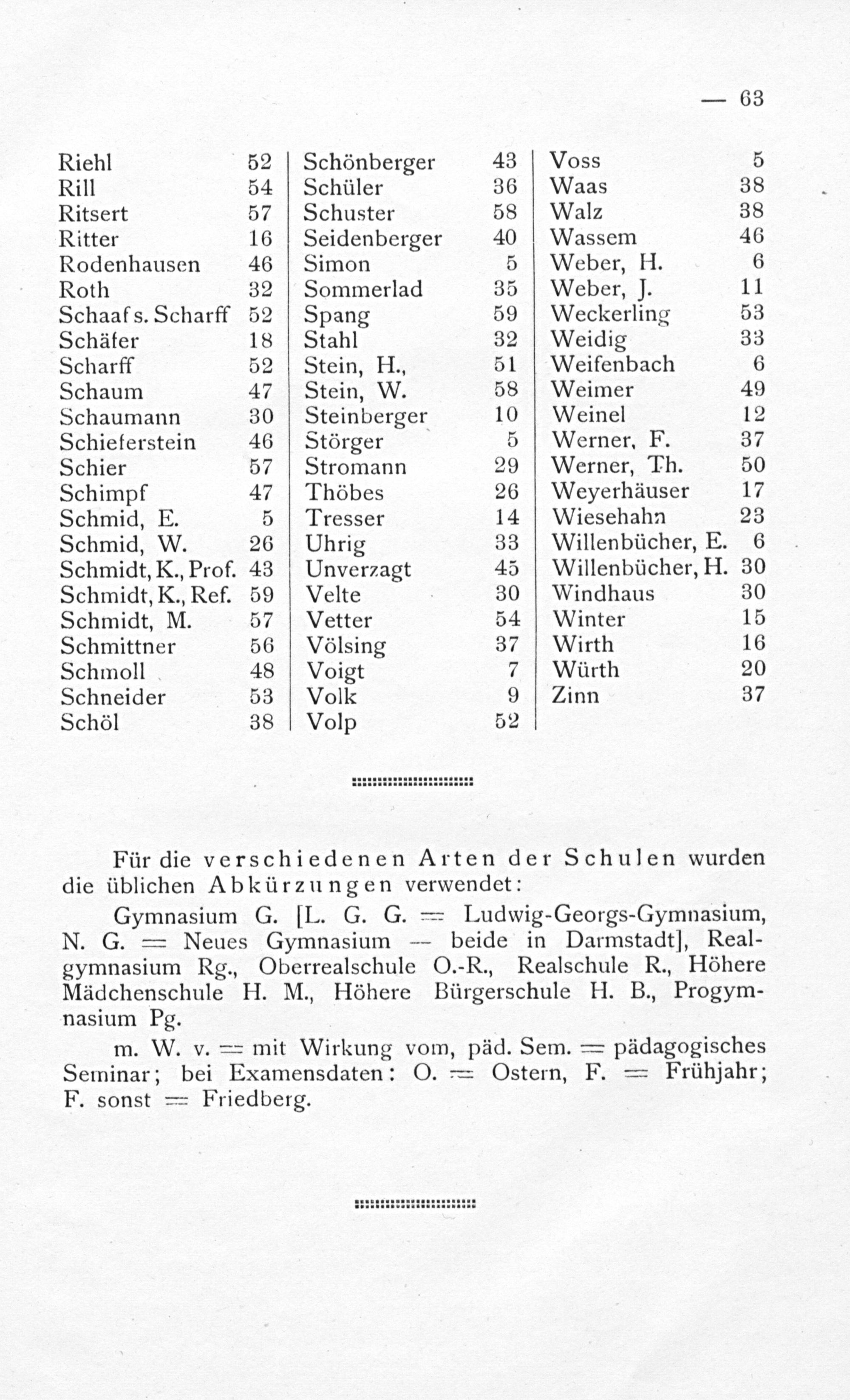 Gymnasium G.[L. G. G.= Ludwig-Georgs-Gymnasium, N. G.= Neues Gymnasium— beide in Darmstadt], Real- gymnasium Rg., Oberrealschule O.-R., Realschule R., Höhere Mädchenschule H. M., Höhere Bürgerschule H. B., Progym- nasium Pg.