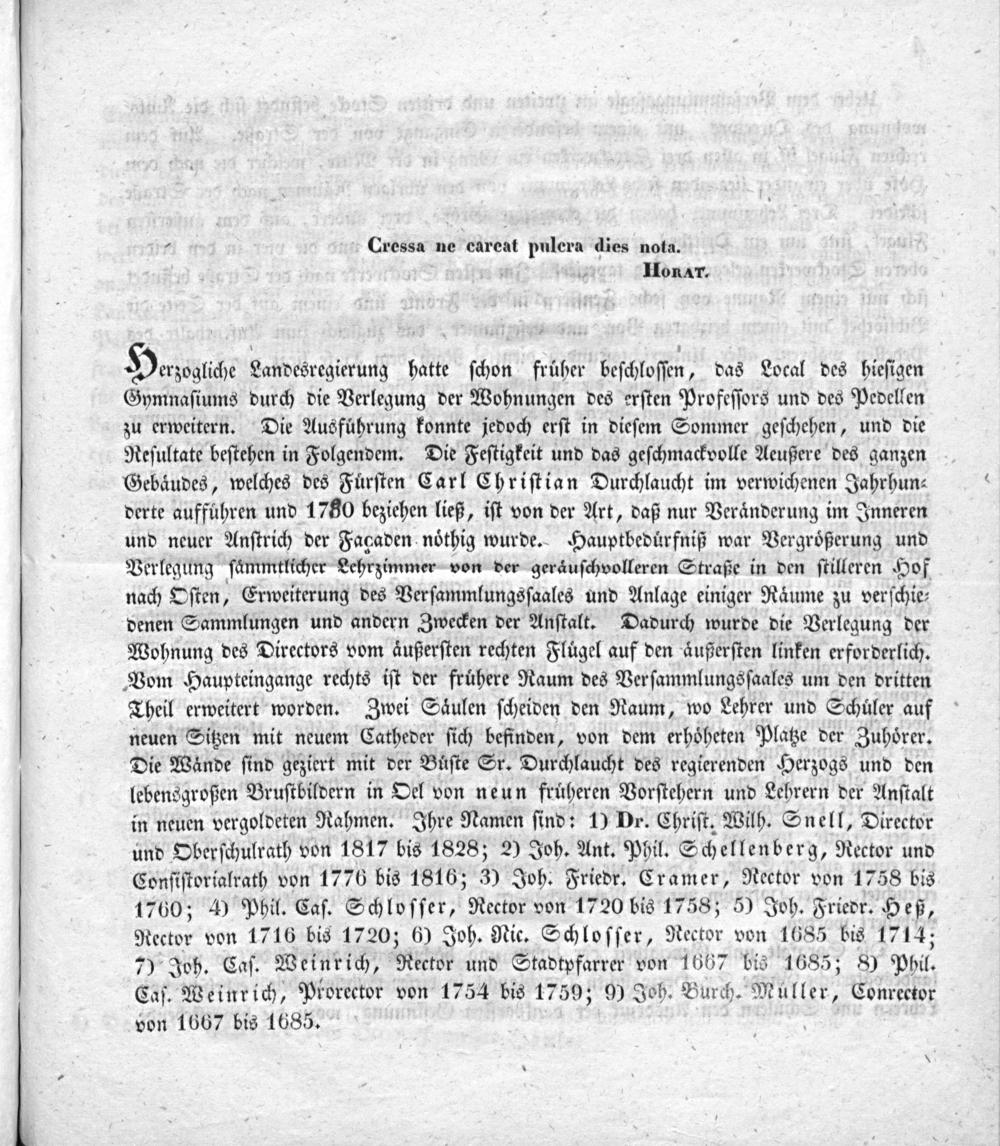 Darzsaliche Landesregierung hatte ſchon fruͤher beſchloſſen, das Local des hieſigen Gymnaſiums durch die Verlegung der Wohnungen des erſten Profeſſors und des Pedellen zu erweitern. Die Ausfuͤhrung konnte jedoch erſt in dieſem Sommer geſchehen, und die Reſultate beſtehen in Folgendem. Die Feſtigkeit und das geſchmackvolle Aeußere des ganzen Gebaͤudes, welches des Fuͤrſten Carl Chriſtian Durchlaucht im verwichenen Jahrhun⸗ derte auffuͤhren und 1780 beziehen ließ, iſt von der Art, daß nur Veraͤnderung im Inneren und neuer Anſtrich der Fagaden noͤthig wurde. Hauptbeduͤrfniß war Vergroͤßerung und Verlegung ſaͤmmtlicher Lehrzimmer von der geraͤuſchvolleren Straße in den ſtilleren Hof nach Oſten, Erweiterung des Verſammlungsſaales und Anlage einiger Raͤume zu verſchie⸗ denen Sammlungen und andern Zwecken der Anſtalt. Dadurch wurde die Verlegung der Wohnung des Directors vom aͤußerſten rechten Fluͤgel auf den aͤußerſten linken erforderlich. Vom Haupteingange rechts iſt der fruͤhere Raum des Verſammlungsſaales um den dritten Theil erweitert worden. Zwei Saͤulen ſcheiden den Raum, wo Lehrer und Schuͤler auf neuen Sitzen mit neuem Catheder ſich befinden, von dem erhoͤheten Platze der Zuhoͤrer. Die Waͤnde ſind geziert mit der Buſte Sr. Durchlaucht des regierenden Herzogs und den lebensgroßen Bruſtbildern in Oel von neun fruheren Vorſtehern und Lehrern der Anſtalt in neuen vergoldeten Rahmen. Ihre Namen ſind: 1) Dr. Chriſt. Wilh. Snell, Director und Oberſchulrath von 1817 bis 1828; 2) Joh. Ant. Phil. Schellenberg, Rector und Conſiſtorialrath von 1776 bis 1816; 3) Joh. Friedr. Cramer, Rector von 1758 bis 1760; 4 Phil. Caſ. Schloſſer, Rector von 1720 bis 1758; 5) Joh. Friedr. Heß, Rector von 1716 bis 1720; 6) Joh. Nic. Schloſſer, Rector von 1685 bis 1714; 7) Joh. Caſ. Weinrich, Rector und Stadtpfarrer von 1667 bis 1685; 8) Phil. Caſ. Weinrich, Piorector von 1754 bis 1759; 9) Joh. Burch. Muller, Conrector von 1667 bis 1685.