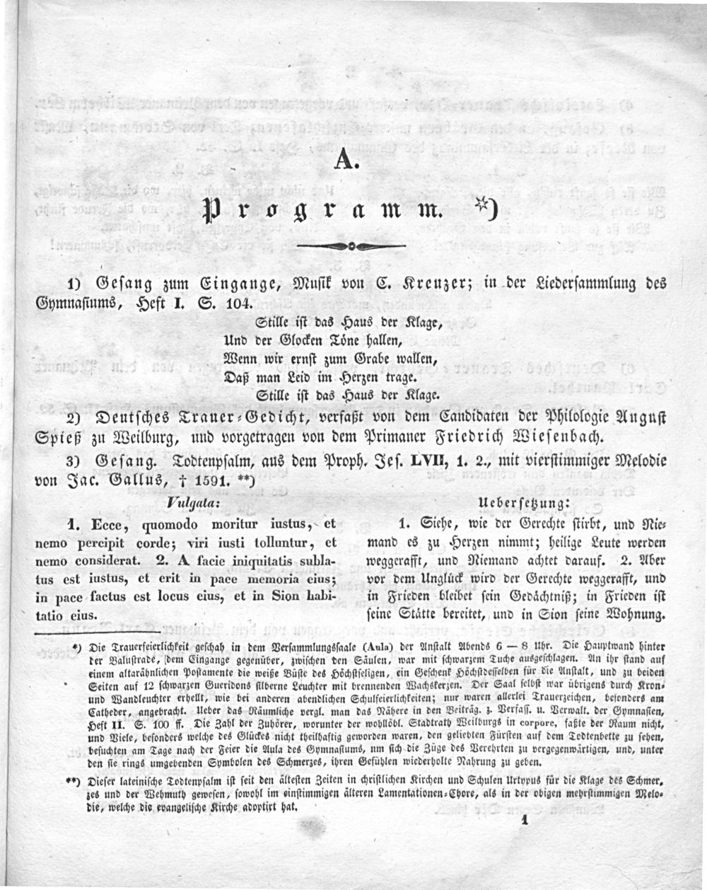 1) Geſang zum Eingange, Muſik von C. Kreuzerv; in der Liederſammlung des Gymnaſiums, Heft I. S. 104. Stille iſt das Haus der Klage, Und der Glocken Toͤne hallen, Wenn wir ernſt zum Grabe wallen, Daß man Leid im Herzen trage. Stille iſt das Haus der Klage. 2) Deutſches Trauer⸗Gedicht, verfaßt von dem Candidaten der Philologie Auguſt Spieß zu Weilburg, und vorgetragen von dem Primaner Friedrich Wieſenbach.