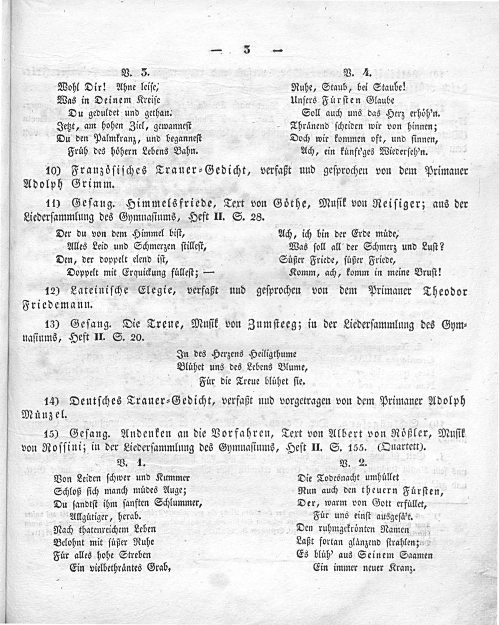 15) Geſang. Andenken an die Vorfahren, Text von Albert von Roͤßler, Muſik von Roſſini; in der Liederſammlung des Gymnaſiums, Heſt II. S. 155.(Duartett).