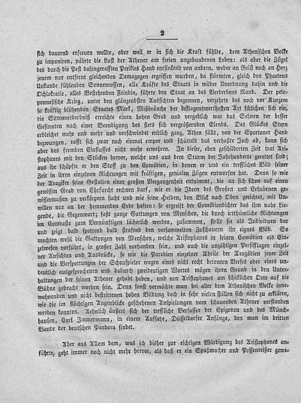 ſich dauernd erfreuen wollte, oder weil er in ſich die Kraft fühlte, dem Atheniſchen Volke zu imponiren, nährte die Luſt der Athener am freien ungebundenen Leben: als aber die Zügel des durch die Peſt dahingerafften Perikles Hand entſinkend von andern, weder an Geiſt noch an Herz jenem nur entfernt gleichenden Demagogen ergriffen wurden, da ſtürmten, gleich den Phaetons Unkunde fühlenden Sonnenroſſen, alle Kräfte des Staats in wilder Unordnung dahin und die Ochlokratie, alles Beſtehenden Feindin, führte den Staat an des Verderbens Rand. Der pelo⸗ ponneſiſche Krieg, unter den glänzendſten Ausſichten begonnen, verzehrte des noch vor Kurzem ſo kräftig blühenden Staates Mark, Mißbräuche der beklagenswertheſten Art ſchlichen ſich ein, die Sittenverderbniß erreichte einen hohen Grad und vergeblich war das Sehnen der beſſer Geſinnten nach einer Beendigung des ſtets ſich vergrößernden Elends. Des Glückes Stern erbleichet mehr und mehr und verſchwindet endlich ganz, Athen fällt, von der Spartaner Hand bezwungen, rafft ſich zwar noch einmal empor und ſchüttelt das verhaßte Joch ab, kann ſich aber des fremden Einfluſſes nicht mehr erwehren. In dieſer, eben geſchilderten Zeit trat Ari⸗ ſtophanes mit den Stücken hervor, welche uns aus dem Sturm der Jahrhunderte gerettet ſind; aus ihr ſchöpfte er den Stoff zu den Comödien, in denen er uns ein treffliches Bild ſeiner Zeit in ihren einzelnen Richtungen mit kräftigen, genialen Zügen entworfen hat. Denn ſo wie der Tragiker ſeine Geſtalten einer großen Vergangenheit entnimmt, die an ſich ſchon auf einen gewiſſen Grad von Ehrfurcht rechnen darf, wie er die Ideen des Großen und Erhabenen ge⸗ wiſſermaßen zu verkörpern ſucht und wie ſeine Helden, den Blick nach Oben gerichtet, mit Un⸗ willen nur an der hemmenden Erde haften: ſo ergreift der Comödiendichter das ihm nahe Lie⸗ gende, die Gegenwart; faßt ganze Gattungen von Menſchen, die durch irrthümliche Richtungen im Contraſte zum Vernünftigen lächerlich werden, zuſammen, ſtellt ſie als Individuen dar und zeigt bald ſpottend bald ſtrafend den verſammelten Zuſchauern ihr eignes Bild. So mochten wohl die Gattungen von Menſchen, welche Ariſtophanes in ſeinen Comödien als Ein⸗ zelweſen vorführt, in großer Zahl vorhanden ſein, und auch die unzähligen Perſifflagen einzel⸗ ner Anſichten und Ausdrücke, ſo wie die Parodien einzelner Theile der Tragödien jener Zeit und die Verſpottungen der Schauſpieler wegen eines nicht recht betonten Verſes oder eines un⸗ deutlich ausgeſprochenen und dadurch zweideutigen Wortes mögen ihren Grund in den Unter⸗ haltungen der feinen Athener gehabt haben, und von Ariſtophanes am ſchicklichen Orte auf die Bühne gebracht worden ſein. Denn ſonſt vermöchte man bei aller dem Atheniſchen Volke inne⸗ wohnenden und nicht beſtrittenen hohen Bildung doch in ſehr vielen Fällen ſich nicht zu erklären, wie die im flüchtigen Augenblicke geſchehenen Anſpielungen vom ſchauenden Athener verſtanden werden konnten. Aehnlich äußert ſich der treffliche Verfaſſer der Epigonen und des Münch⸗ hauſen, Carl Immermann, in einem Aufſatze, Düſſeldorfer Anfänge, den man im dritten Bande der deutſchen Pandora findet.
