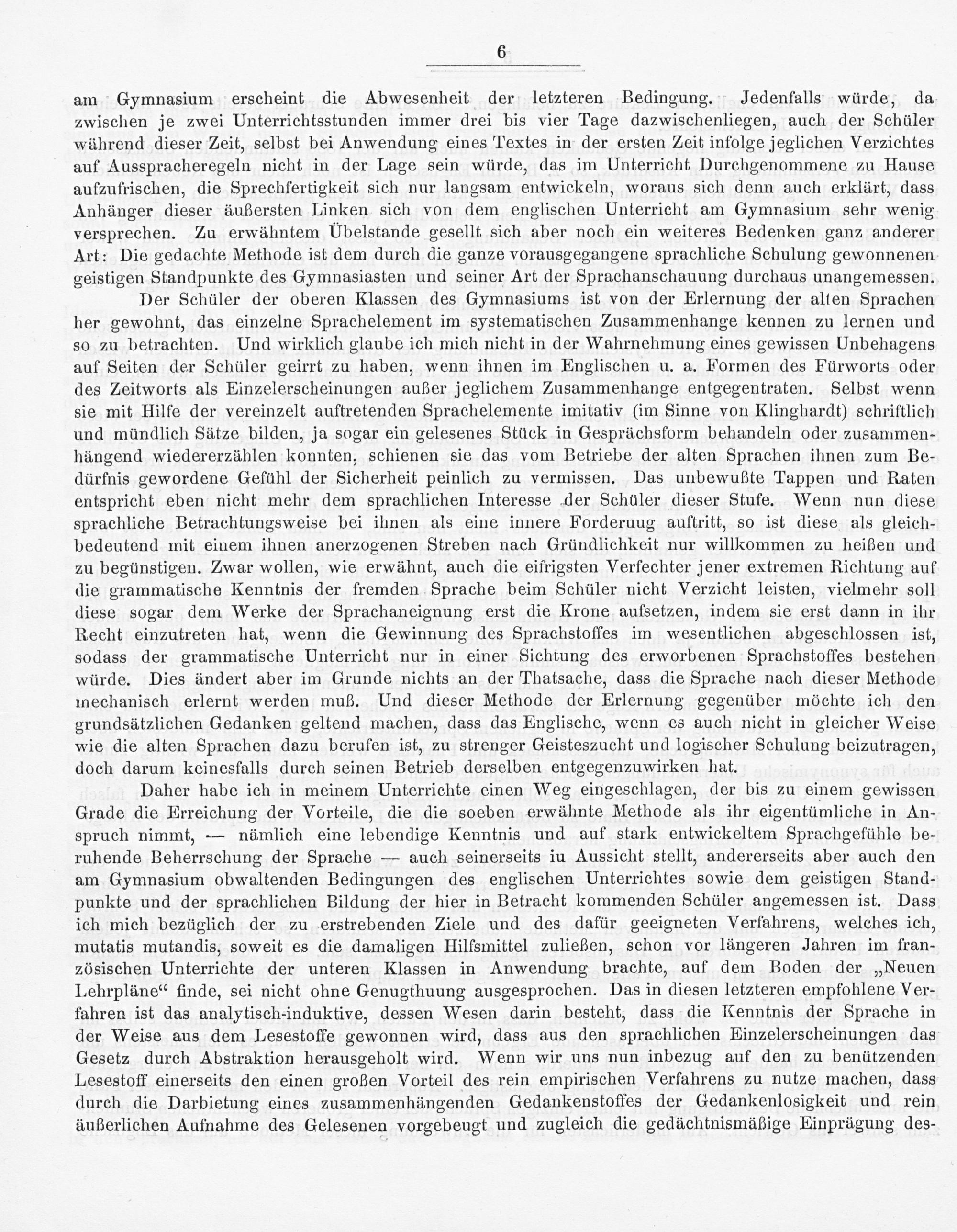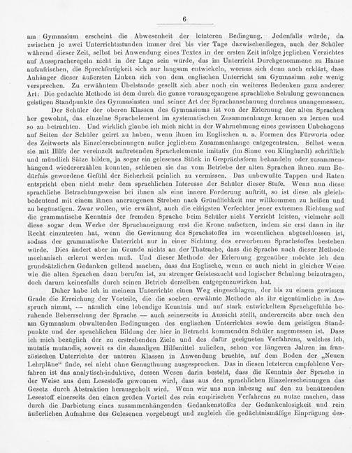 am Gymnasium erscheint die Abwesenheit der letzteren Bedingung. Jedenfalls würde, da zwischen je zwei Unterrichtsstunden immer drei bis vier Tage dazwischenliegen, auch der Schüler während dieser Zeit, selbst bei Anwendung eines Textes in der ersten Zeit infolge jeglichen Verzichtes auf Ausspracheregeln nicht in der Lage sein würde, das im Unterricht Durchgenommene zu Hause aufzufrischen, die Sprechfertigkeit sich nur langsam entwickeln, woraus sich denn auch erklärt, dass Anhänger dieser äußersten Linken sich von dem englischen Unterricht am Gymnasium sehr wenig versprechen. Zu erwähntem Übelstande gesellt sich aber noch ein weiteres Bedenken ganz anderer Art: Die gedachte Methode ist dem durch die ganze vorausgegangene sprachliche Schulung gewonnenen geistigen Standpunkte des Gymnasiasten und seiner Art der Sprachanschauung durchaus unangemessen.
