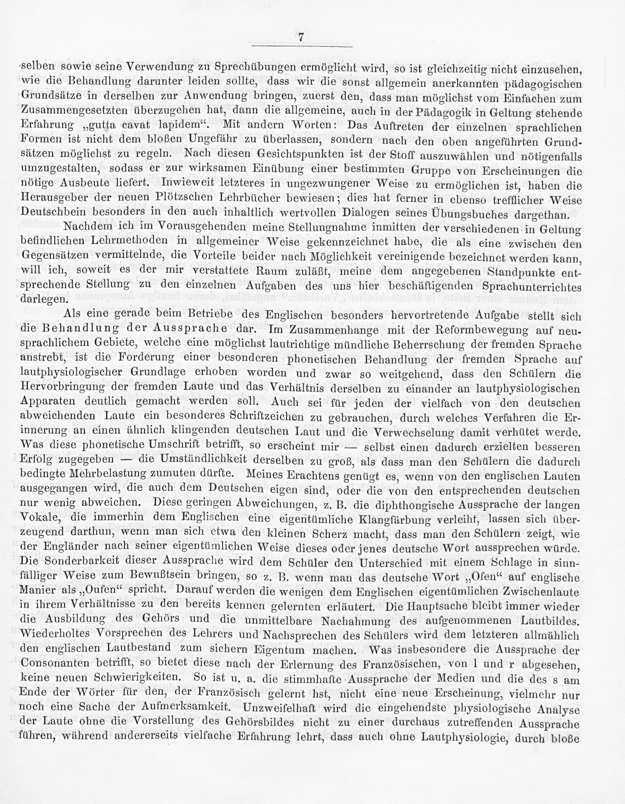 Nachdem ich im Vorausgehenden meine Stellungnahme inmitten der verschiedenen in Geltung befindlichen Lehrmethoden in allgemeiner Weise gekennzeichnet habe, die als eine zwischen den Gegensätzen vermittelnde, die Vorteile beider nach Möglichkeit vereinigende bezeichnet werden kann, will ich, soweit es der mir verstattete Raum zuläßt, meine dem angegebenen Standpunkte ent- sprechende Stellung zu den einzelnen Aufgaben des uns hier beschäftigenden Sprachunterrichtes darlegen.