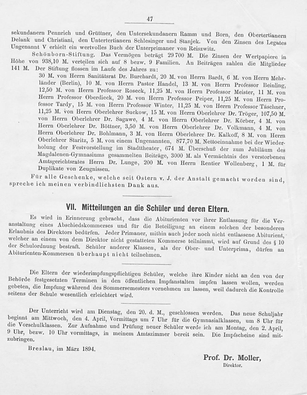 Breslau, im März 1894. Prof. Dr. Moller,