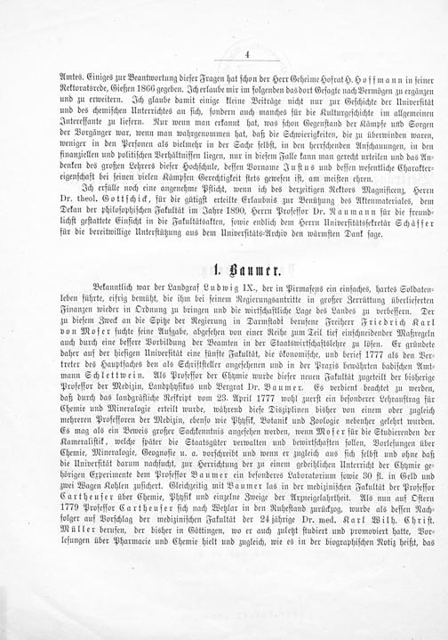 Bekanntlich war der Landgraf Ludwig IX., der in Pirmaſens ein einfaches, hartes Soldaten⸗ leben führte, eifrig bemüht, die ihm bei ſeinem Regierungsantritte in großer Zerrüttung überlieferten Finanzen wieder in Ordnung zu bringen und die wirtſchaftliche Lage des Landes zu verbeſſern. Der zu dieſem Zweck an die Spitze der Regierung in Darmſtadt berufene Freiherr Friedrich Karl von Moſer ſuchte ſeine Aufgabe, abgeſehen von einer Reihe zum Teil tief einſchneidender Maßregeln auch durch eine beſſere Vorbildung der Beamten in der Staatswirtſchaftslehre zu löſen. Er gründete daher auf der hieſigen Univerſität eine fünfte Fakultät, die ökonomiſche, und berief 1777 als den Ver⸗ treter des Hauptfaches den als Schriftſteller angeſehenen und in der Praxis bewährten badiſchen Amt⸗ mann Schlettwein. Als Profeſſor der Chymie wurde dieſer neuen Fakultät zugeteilt der bisherige Profeſſor der Medizin, Landphyſikus und Bergrat Dr. Baumer. Es verdient beachtet zu werden, daß durch das landgräfliche Reſkript vom 23. April 1777 wohl zuerſt ein beſonderer Lehrauftrag für Chemie und Mineralogie erteilt wurde, während dieſe Disziplinen bisher von einem oder zugleich mehreren Profeſſoren der Medizin, ebenſo wie Phyſik, Botanik und Zoologie nebenher gelehrt wurden. Es mag als ein Beweis großer Sachkenntnis angeſehen werden, wenn Moſer für die Studierenden der Kameraliſtik, welche ſpäter die Staatsgüter verwalten und bewirtſchaften ſollen, Vorleſungen über Chemie, Mineralogie, Geognoſie u. a. vorſchreibt und wenn er zugleich aus ſich ſelbſt und ohne daß die Univerſität darum nachſucht, zur Herrichtung der zu einem gedeihlichen Unterricht der Chymie ge⸗ hörigen Experimente dem Profeſſor Baumer ein beſonderes Laboratorium ſowie 30 fl. in Geld und zwei Wagen Kohlen zuſichert. Gleichzeitig mit Baumer las in der mediziniſchen Fakultät der Profeſſor Cartheuſer über Chemie, Phyſik und einzelne Zweige der Arzneigelahrtheit. Als nun auf Oſtern 1779 Profeſſor Cartheuſer ſich nach Wetzlar in den Ruheſtand zurückzog, wurde als deſſen Nach⸗ folger auf Vorſchlag der mediziniſchen Fakultät der 24 jährige Dr. med. Karl Wilh. Chriſt. Müller berufen, der bisher in Cöttingen, wo er auch zuletzt ſtudiert und promoviert hatte, Vor⸗ leſungen über Pharmacie und Chemie hielt und zugleich, wie es in der biographiſchen Notiz heißt, das