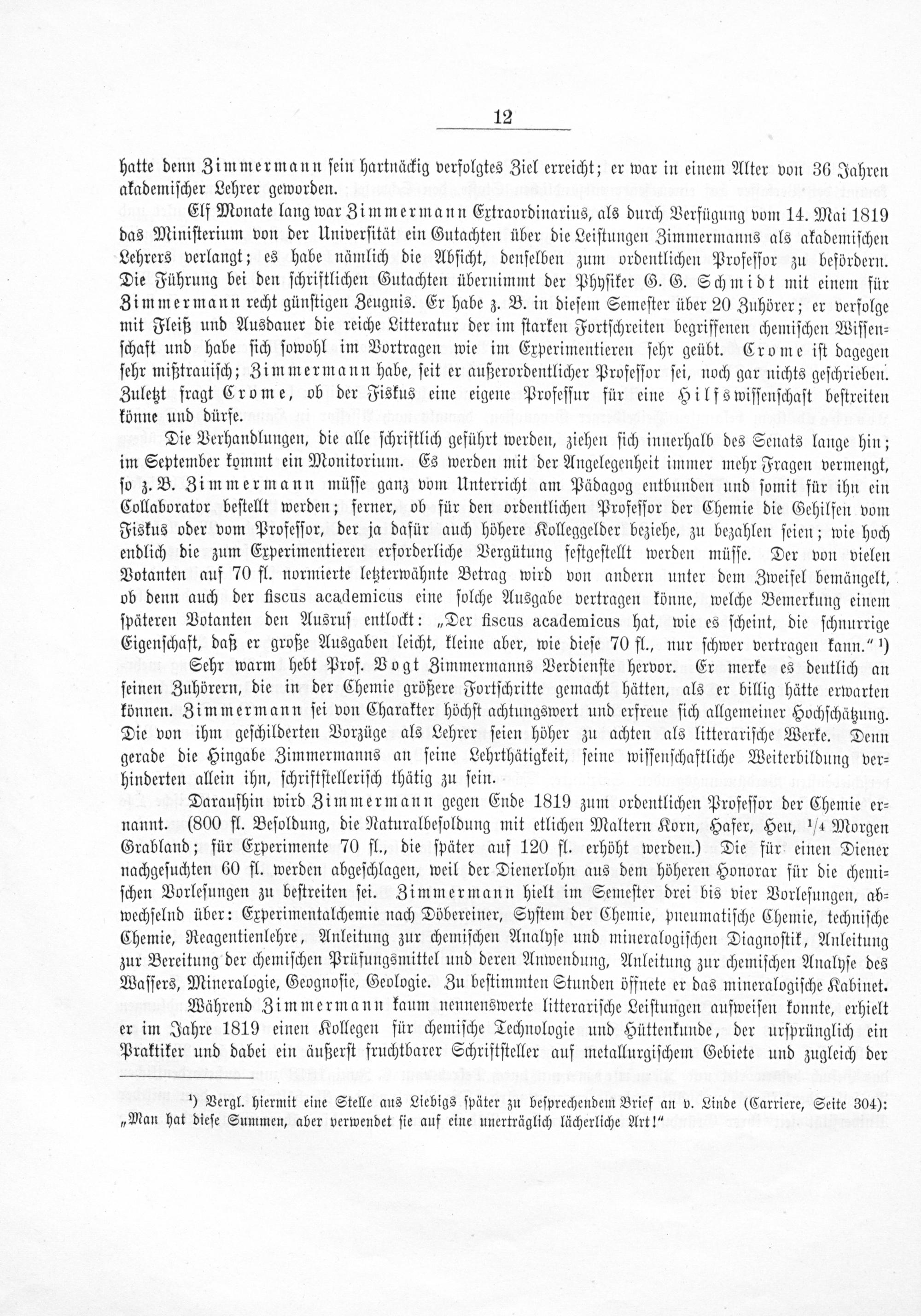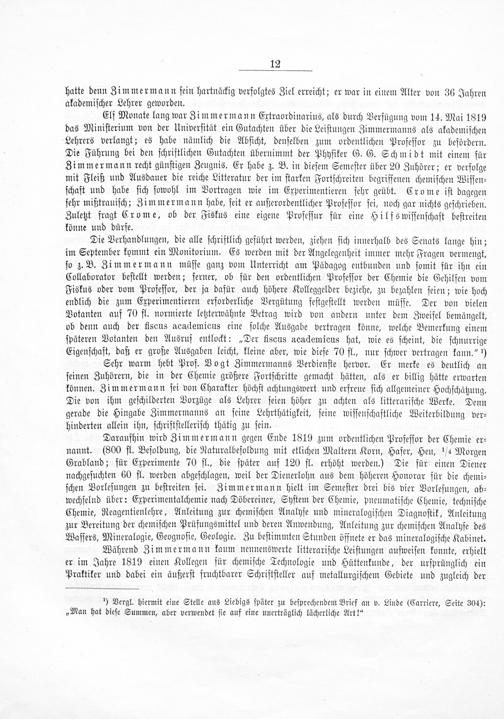 Elf Monate lang war Zimmermann Extraordinarius, als durch Verfügung vom 14. Mai 1819 das Miniſterium von der Univerſität ein Gutachten über die Leiſtungen Zimmermanns als akademiſchen Lehrers verlangt; es habe nämlich die Abſicht, denſelben zum ordentlichen Profeſſor zu befördern. Die Führung bei den ſchriftlichen Gutachten übernimmt der Phyſiker G. G. Schmidt mit einem für Zimmermann recht günſtigen Zeugnis. Er habe z. B. in dieſem Semeſter über 20 Zuhörer; er verfolge mit Fleiß und Ausdauer die reiche Litteratur der im ſtarken Fortſchreiten begriffenen chemiſchen Wiſſen⸗ ſchaft und habe ſich ſowohl im Vortragen wie im Experimentieren ſehr geübt. Crome iſt dagegen ſehr mißtrauiſch; Zimmermann habo, ſeit er außerordentlicher Profeſſor ſei, noch gar nichts geſchrieben. Zuletzt fragt Crome, ob der Fiskus eine eigene Profeſſur für eine Hilfsviſſenſchaſt beſtreiten könne und dürfe.