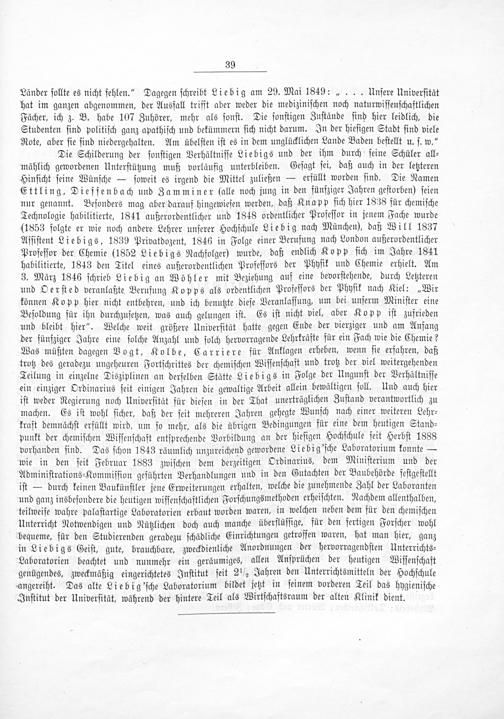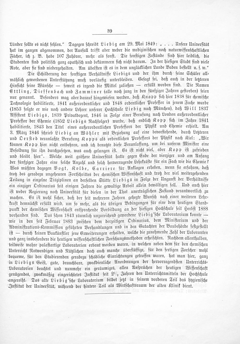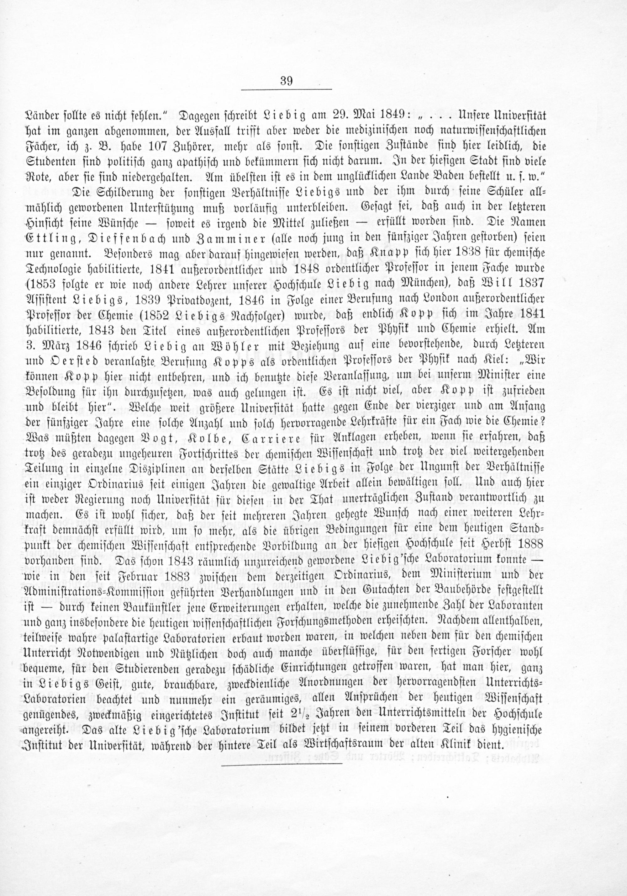 Länder ſollte es nicht fehlen.“ Dagegen ſchreibt Liebig am 29. Mai 1849:„... Unſere Univerſität hat im ganzen abgenommen, der Ausfall trifft aber weder die mediziniſchen noch naturwiſſenſchaftlichen Fächer, ich z. B. habe 107 Zuhörer, mehr als ſonſt. Die ſonſtigen Zuſtände ſind hier leidlich, die Studenten ſind politiſch ganz apathiſch und bekümmern ſich nicht darum. In der hieſigen Stadt ſind viele Rote, aber ſie ſind niedergehalten. Am übelſten iſt es in dem unglücklichen Lande Baden beſtellt u. ſ. w.“ Die Schilderung der ſonſtigen Verhältniſſe Liebigs und der ihm durch ſeine Schüler all⸗ mählich gewordenen Unterſtützung muß vorläufig unterbleiben. Geſagt ſei, daß auch in der letzteren Hinſicht ſeine Wünſche— ſoweit es irgend die Mittel zuließen— erfüllt worden ſind. Die Namen Ettling, Dieffenbach und Zamminer qlalle noch jung in den fünßziger Jahren geſtorben) ſeien nur genannt. Beſonders mag aber darauf hingewieſen werden, daß Knapp ſich hier 1838 für chemiſche Technologie habilitierte, 1841 außerordentlicher und 1848 ordentlicher Profeſſor in jenem Fache wurde (1853 folgte er wie noch andere Lehrer unſerer Hochſchule Liebig nach München), daß Will 1837 Aſſiſtent Liebigs, 1839 Privatdozent, 1846 in Folge einer Berufung nach London außerordentlicher Profeſſor der Chemie(1852 Liebigs Nachfolger) wurde, daß endlich Kopp ſich im Jahre 1841 habilitierte, 1843 den Titel eines außerordentlichen Profeſſors der Phyſik und Chemie erhielt. Am 3. März 1846 ſchrieb Liebig an Wöhler mit Beziehung auf eine bevorſtehende, durch Letzteren und Oerſted veranlaßte Berufung Kopps als ordentlichen Profeſſors der Phyſik nach Kiel:„Wir können Kopp hier nicht entbehren, und ich benutzte dieſe Veranlaſſung, um bei unſerm Miniſter eine Beſoldung für ihn durchzuſetzen, was auch gelungen iſt. Es iſt nicht viel, aber Kopp iſt zufrieden und bleibt hier“. Welche weit größere Univerſität hatte gegen Ende der vierziger und am Anfang der fünfziger Jahre eine ſolche Anzahl und ſolch hervorragende Lehrkräfte für ein Fach wie die Chemie? Was müßten dagegen Vogt, Kolbe, Carriere für Anklagen erheben, wenn ſie erfahren, daß trotz des geradezu ungeheuren Fortſchrittes der chemiſchen Wiſſenſchaft und trotz der viel weitergehenden Teilung in einzelne Disziplinen an derſelben Stätte Liebigs in Folge der Ungunſt der Verhältniſſe ein einziger Ordinarius ſeit einigen Jahren die gewaltige Arbeit allein bewältigen ſoll. Und auch hier iſt weder Regierung noch Univerſität für dieſen in der That unerträglichen Zuſtand verantwortlich zu machen. Es iſt wohl ſicher, daß der ſeit mehreren Jahren gehegte Wunſch nach einer weiteren Lehr⸗ kraft demnächſt erfüllt wird, um ſo mehr, als die übrigen Bedingungen für eine dem heutigen Stand⸗ punkt der chemiſchen Wiſſenſchaft entſprechende Vorbildung an der hieſigen Hochſchule ſeit Herbſt 1888 vorhanden ſind. Das ſchon 1843 räumlich unzureichend gewordene Liebig'ſche Laboratorium konnte— wie in den ſeit Februar 1883 zwiſchen dem derzeitigen Ordinarius, dem Miniſterium und der Adminiſtrations⸗Kommiſſion geführten Verhandlungen und in den Gutachten der Baubehörde feſtgeſtellt iſt— durch keinen Baukünſtler jene Erweiterungen erhalten, welche die zunehmende Zahl der Laboranten und ganz insbeſondere die heutigen wiſſenſchaftlichen Forſchungsmethoden erheiſchten. Nachdem allenthalben, teilweiſe wahre palaſtartige Laboratorien erbaut worden waren, in welchen neben dem für den chemiſchen Unterricht Notwendigen und Nützlichen doch auch manche überflüſſige, für den fertigen Forſcher wohl bequeme, für den Studierenden geradezu ſchädliche Einrichtungen getroffen waren, hat man hier, ganz in Liebigs Geiſt, gute, brauchbare, zweckdienliche Anordnungen der hervorragendſten Unterrichts⸗ Laboratorien beachtet und nunmehr ein geräumiges, allen Anſprüchen der heutigen Viſſenſchaft genügendes, zweckmäßig eingerichtetes Inſtitut ſeit 2 ½ Jahren den Unterrichtsmitteln der Hochſchule angereiht. Das alte Liebig'ſche Laboratorium bildet jetzt in ſeinem vorderen Teil das hygieniſche Inſtitut der Univerſität, während der hintere Teil als Wirtſchaftsraum der alten Klinik dient.