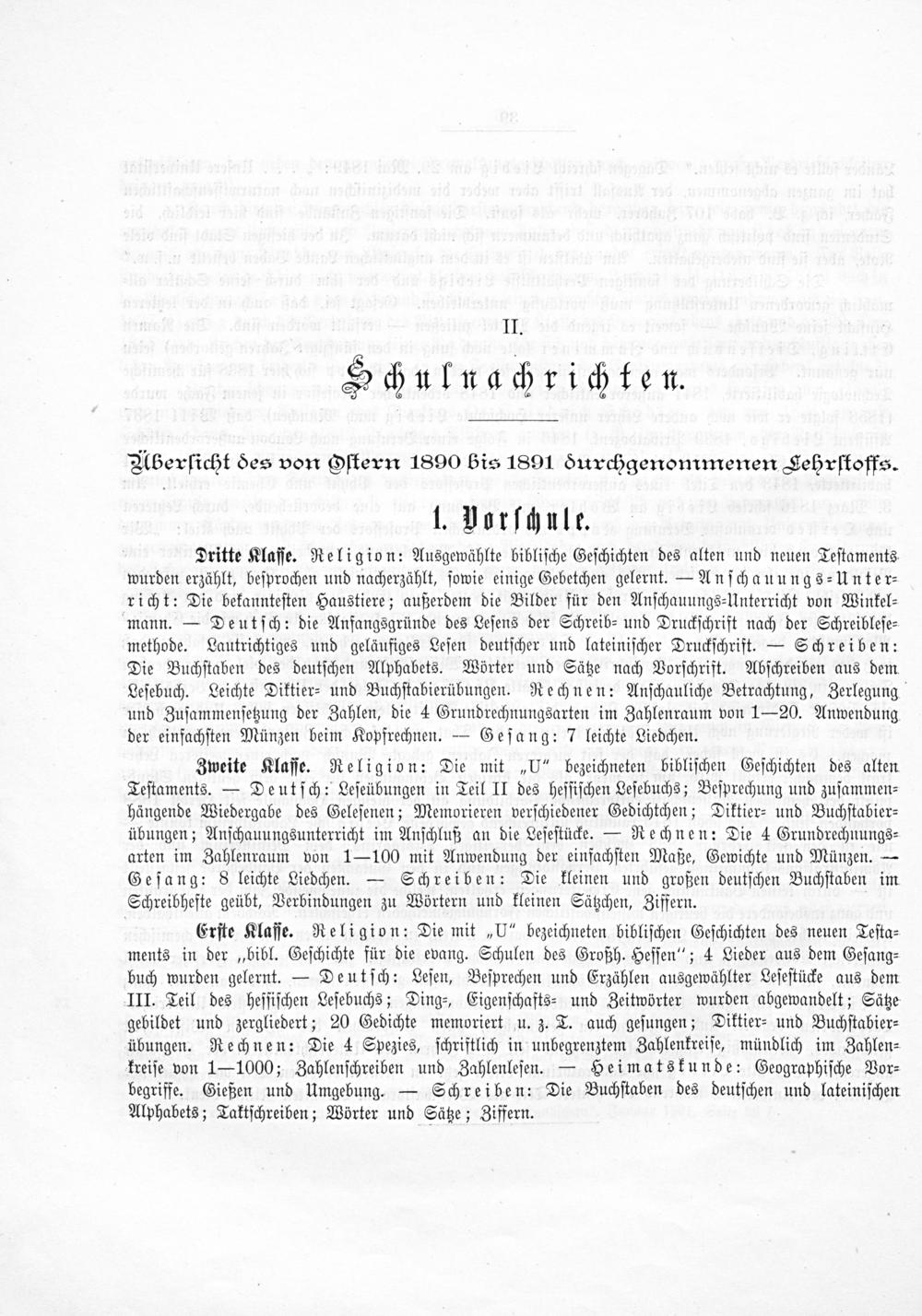 Erſte Klaſſe. Religion: Die mit„U“ bezeichneten bibliſchen Geſchichten des neuen Teſta⸗ ments in der„bibl. Geſchichte für die evang. Schulen des Großh. Heſſen“; 4 Lieder aus dem Geſang⸗ buch wurden gelernt.— Deutſch: Leſen, Beſprechen und Erzählen ausgewählter Leſeſtücke aus dem III. Teil des heſſiſchen Leſebuchs; Ding⸗, Eigenſchafts⸗ und Zeitwörter wurden abgewandelt; Sätze gebildet und zergliedert; 20 Gedichte memoriert u. z. T. auch geſungen; Diktier⸗ und Buchſtabier⸗ übungen. Rechnen: Die 4 Spezies, ſchriftlich in unbegrenztem Zahlenkreiſe, mündlich im Zahlen⸗ kreiſe von 1— 1000; Zahlenſchreiben und Zahlenleſen.— Heimatskunde: Geggraphiſche Vor⸗ begriffe. Gießen und Umgebung.— Schreiben: Die Buchſtaben des deutſchen und lateiniſchen Alphabets; Taktſchreiben; Wörter und Sätze; Ziffern.