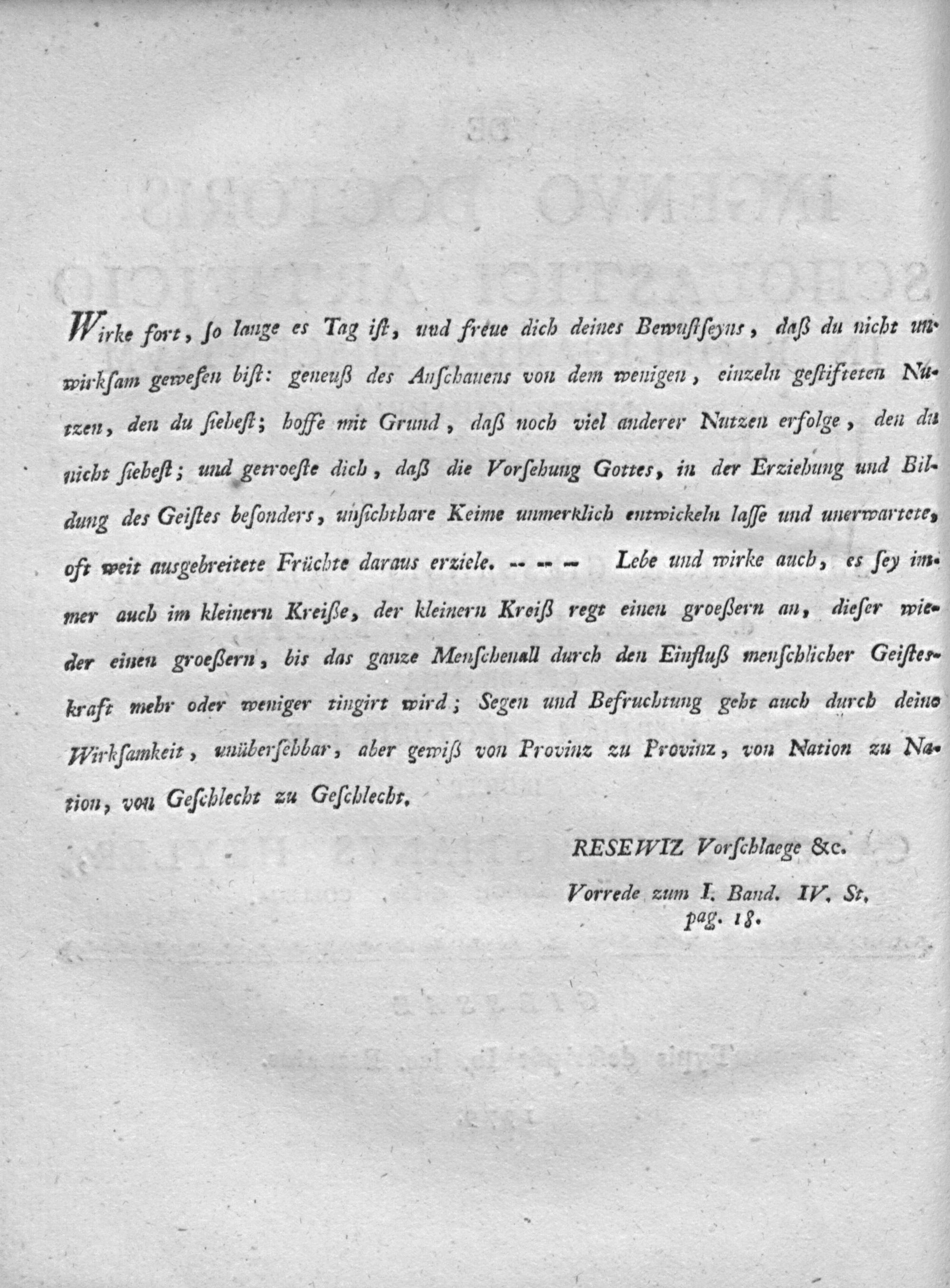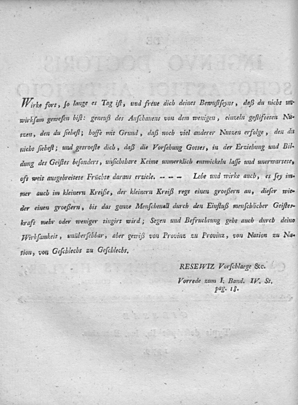 Mirie fort, ſo lange es Tag iſt, und freue dich deines Bewuftſour, daß du nicht um- wirkſam geweſen biſt: geneuß der Auſchauens von dem weuigen, einzeln geſtifreten Nu- rzen, den du fiebeſt; boffe mit Grund, daß noch viel anderer Nutzen erfolge, den du nicht ſiebeſt; und getroeſte dich, daß die Vorſehung Gortes, in der Erziehung und Bil- dung des Geiſtes beſonders, B2 Wchthare Keime unmerklich anelehe laſſe und unerwartete, oft weit ausgebreitere Früchte daraus erziele.-— Lebe und wirke auch, es ſey im- mer auch im Keinern Kreiße, der Keinern Kreiß regt einen groeßern au, dieſer wie- der einen groeßern, bis das gauze AMenſchenal durch den Einufluß menſchlicher Geiſtes- kraft mebr oder weniger ringirt wird; Segen und Befruchtung gebt auch durch deine Wirkſamkeit, unukerſebbar, aber gewiß von Provinz zu Provinz, von Nation zu Na- rjon, von Geſchlecht zu Geſchlecht. RESEMWIZ Vorſchlaege&c.