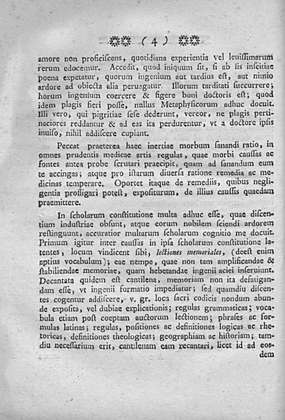 In ſcholarum conſtitutione multa adhuc eſſe, quae diſcen- tium induſtriae obſunt, atque eorum nobilem ſciendi ardorem reſtinguunt, accuratior multarum ſcholarum cognitio me docuit. Primum igitur inter cauſſas in ipſa ſcholarum conſtitutione la- tentes, locum vindicent ſibi, lectiones memoriales,(deeſt enim aptius vocabulum); eae nempe, quae non tam amplificandae& ſtabiliendae memoriae, quam hebetandae ingenii aciei inſeruiunt. Decantata quidem eſt cantilena, memoriam non ita defatigan- dam eſſe, vt ingenii formatio impediatur; ſed quamdiu diſcen- tes cogentur addiſcere, v. gr. loca ſacri codicis nondum abun- de expoſita, vel dubiae explicationis; regulas grammaticas; voca- bula etiam poſt coeptam auctorum lectionem; phraſes ac for- mulas latinas; regulas, poſitiones ac definitiones logicas ac rhe- toricas, definitiones theologicas; geographiam ac hiſtoriam; tam- diu neceſſarium erit, cantilenam eam recantari, licet id ad eos-