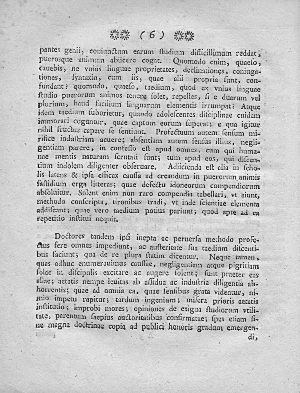 Doctores tandem ipſi inepta ac peruerſa methodo profe- Kus fere omnes impediunt, ac auſteritate ſua taedium diſcenti- bus faciunt; qua de re plura ſtatim dicentur. Neque tamen, quas adhuc enumerauimus cauſſae, negligentiam atque pigritiam ſolae in diſcipulis excitare ac augere ſolent; ſunt praeter eas aliae; aetatis nempe leuitas ab aſſidua ac induſtria diligentia ab- horrentis; quae ad omnia ca, quae ſenſibus grata videntur, ni- mio impetu rapitur; tardum ingenium; milera prioris aetatis inſtitutio; improbi mores; opiniones de exigua ſtudiorum vtili- tate, Parentum ſaepius auctoritatibus confirmatae; ſpes etiam ſi- ne magna doctrinae copia ad publici honoris gradum emergen- . di,