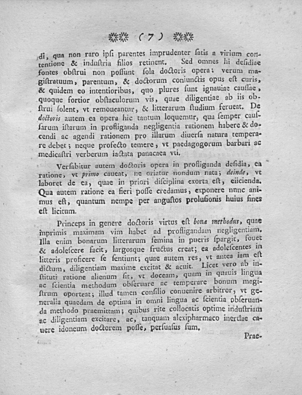 Princeps in genere doctoris virtus eſt bona methodus, quae inprimis maximam vim habet ad profligandam negligentiam. Illa enim bonarum litterarum ſemina in pueris ſpargit, fouet & adoleſcere facit, largosque fructus creat; ea adoleſcentes in litteris proficere ſe ſentiunt; quae autem res, vt anten iaru e dictum, diligentiam maxime excitat& acuit. Licet vero ab in- ſtituti ratione alienum ſit, vt doccam, quam in quauis lingua ac ſcientia methodum obleruare ac temperare bonum megi⸗ ſtrum oporteat; illud tamen confilio conuenire arbitror, vt ge- neralia quaedam de optima in omni lingua ac ſcientia obſeruan- da methodo praemittam; quibus rite collocatis optime induſtriam ac diligentiam excitare, ac, tanquam alexipharmaco inertiae ca- uere idoneum doctorem poſſe, perſuaſus ſum.