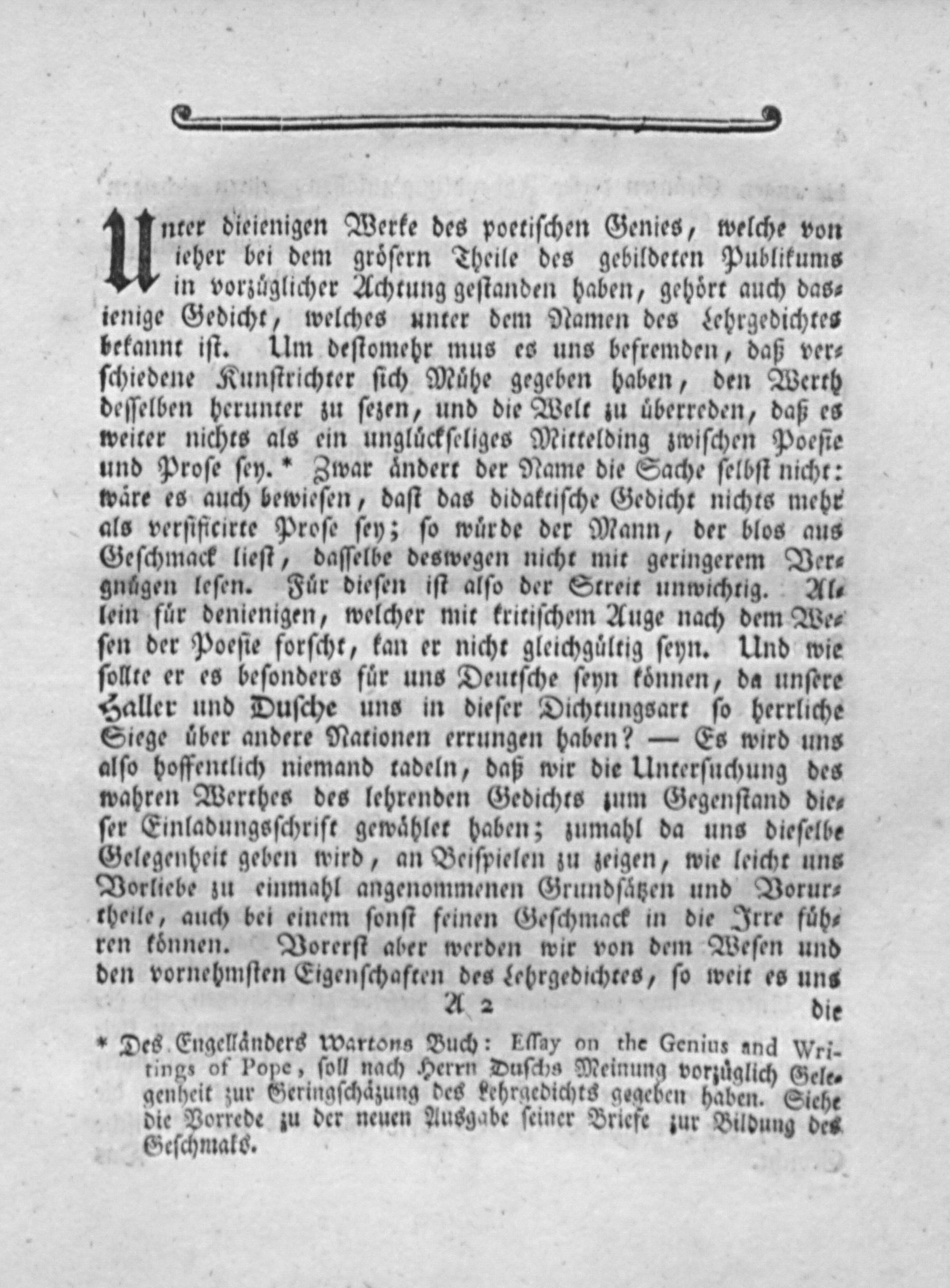 bekannt iſt. Um deſtomehr mus es uns befremden, daß ver⸗ ſchiedene Kunſtrichter ſich Muͤhe gegeben haben, den Werth deſſelben herunter zu ſezen, und die Welt zu uüberreden, daß es weiter nichts als ein ungluͤckſeliges Mittelding zwiſchen Poeſie und Proſe ſey.“ Zwar aͤndert der Name die Sache ſelbſt nicht: wäre es auch bewieſen, daſt das didaktiſche Gedicht nichts mehr als verſificirte Proſe ſey; ſo wuͤrde der Mann, der blos aus