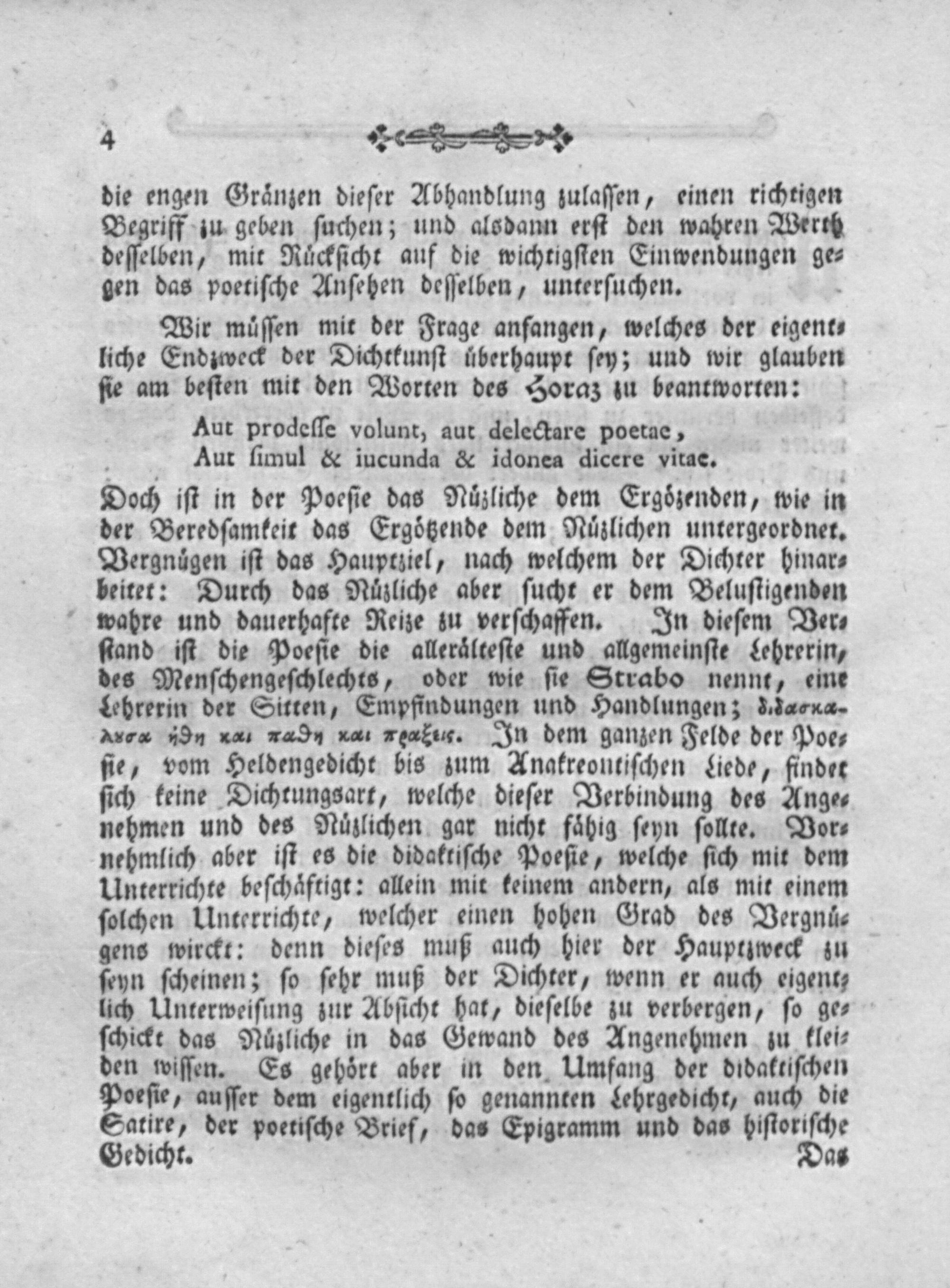 Wir muͤſſen mit der Frage anfangen, welches der eigent⸗ liche Endzweck der Dichtkunſt uͤberhaupt ſey; und wir glauben ſie am beſten mit den Worten des Horaz zu beantworten: