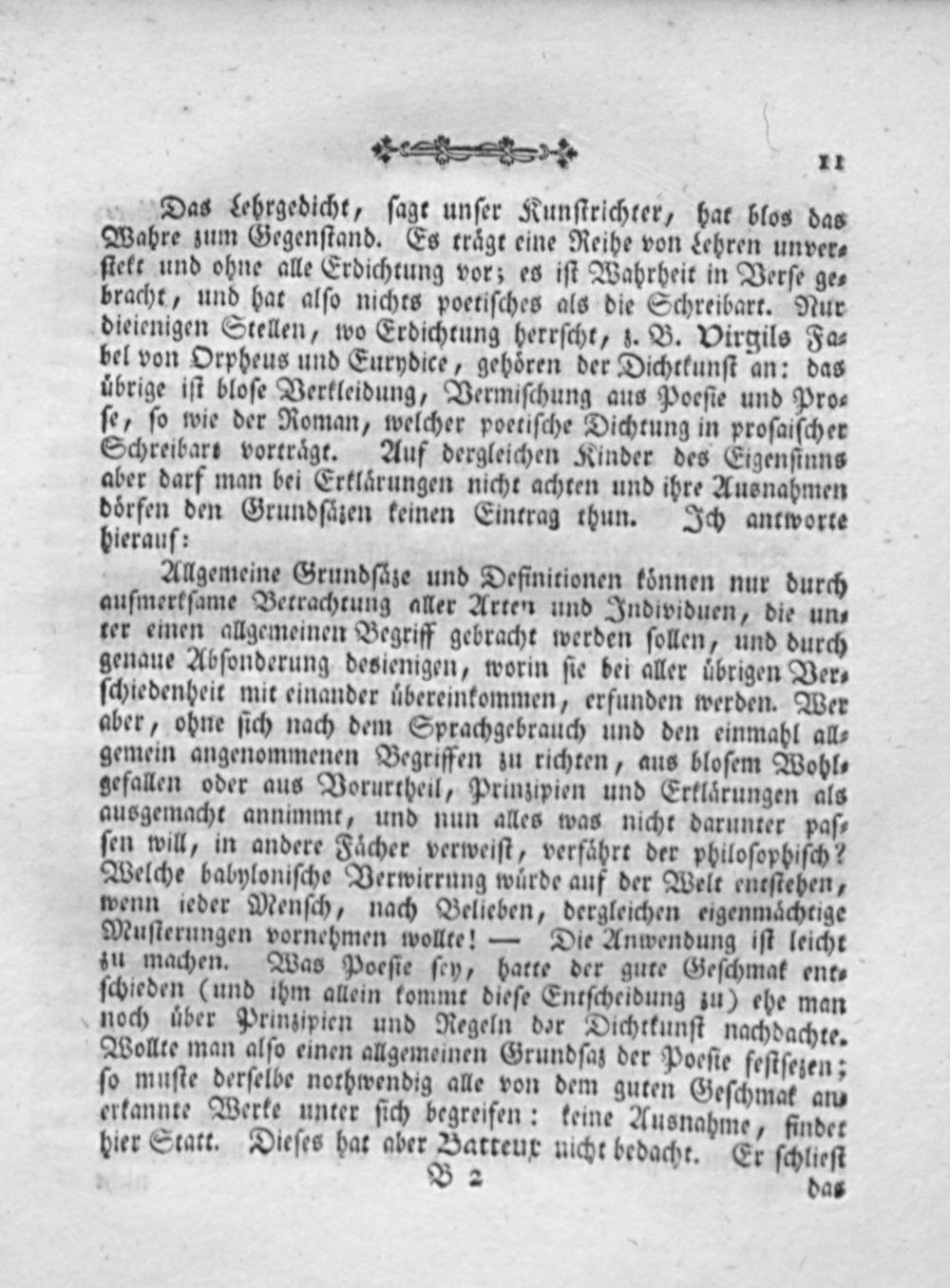 Das(ehrgedicht, ſagt unſer Kunſtrichter, hat blos das Wahre zum Gegenſtand. Es traͤgt eine Reihe von Lehren unver⸗ ſtekt und ohne alle Erdichtung vor; es iſt Wahrheit in Verſe ge⸗ bracht, und hat alſo nichts poetiſches als die Schreibart. Nur dieienigen Stellen, wo Erdichtung herrſcht, z. B. Virgiles Fa⸗ bel von Orpheus und Eurydice, gehoͤren der Dichtkunſt an: das ubrige iſt bloſe Verkleidung, Vermiſchung aus Poeſie und Pro⸗ ſe, ſo wie der Roman, welcher poetiſche Dichtung in proſaiſcher Schreibart vortraͤgt. Auf dergleichen Kinder des Eigenſinns aber darf man bei Erklaͤrungen nicht achten und ihre Ausnahmen deeſene den Grundſäzen keinen Eintrag thun. Ich antworte ierauf: