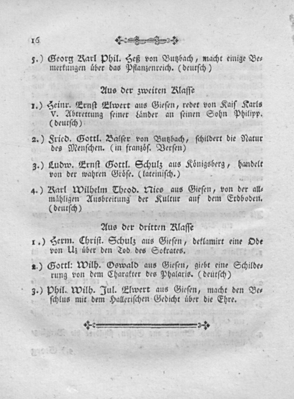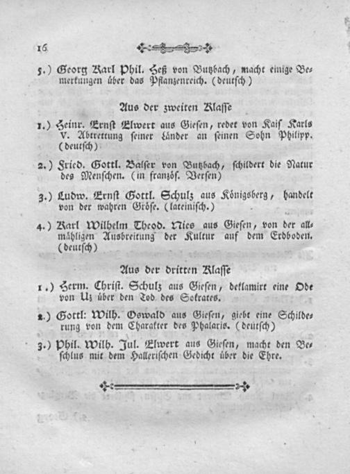 1.) Berm. Chriſt. Schulz aus Gieſen, deklamirt eine Ode von Uz uͤber den Tod des Sokrates.