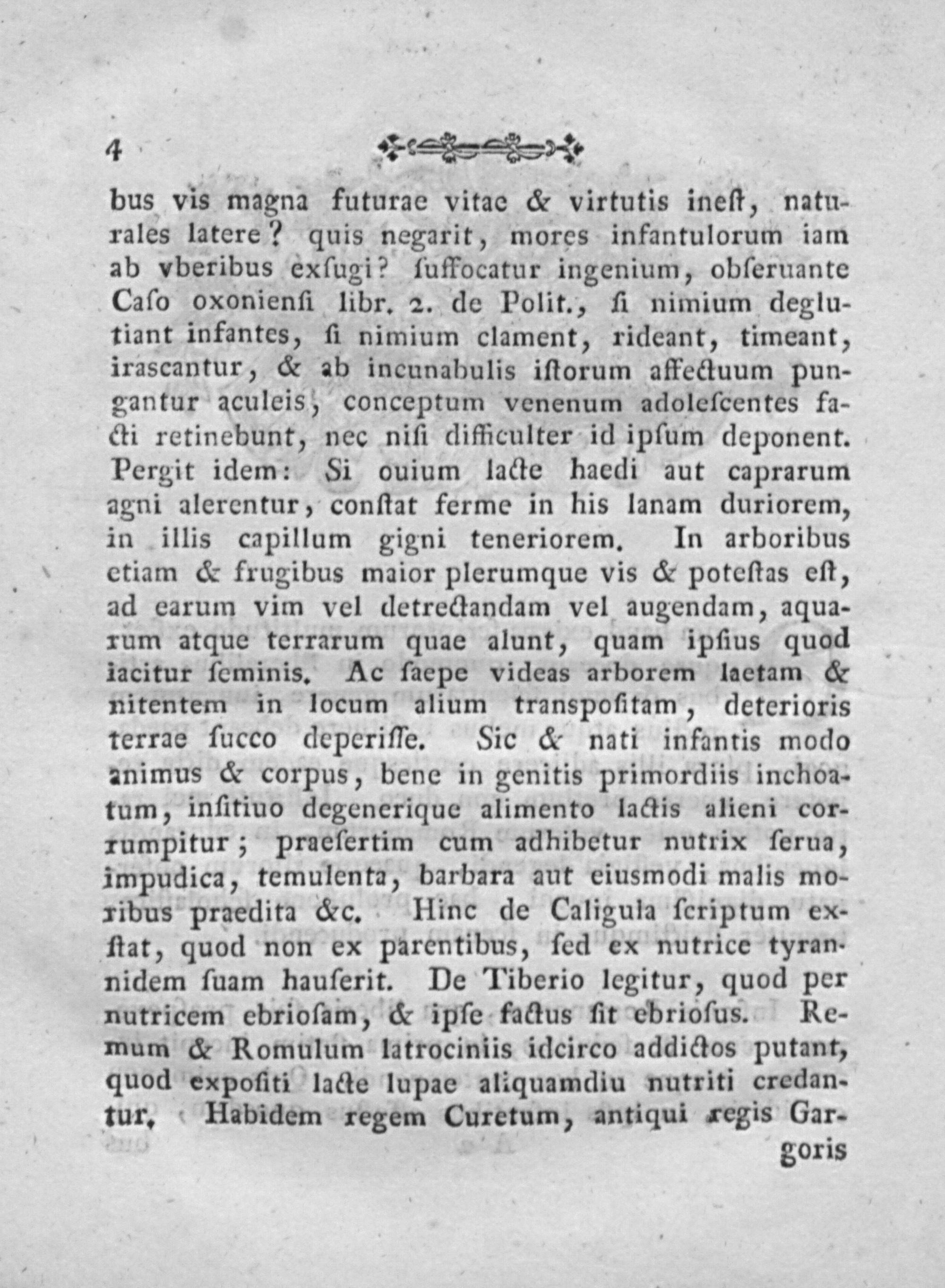 bus vis magna futurae vitae& virtutis ineſt, natu- rales latere? quis negarit, mores infantulorum iam ab vberibus exſugi? fuffocatur ingenium, obſeruante Caſo oxonienſi libr. 2. de Polit., ſi nimium deglu- tiant infantes, ſi nimium clament, rideant, timeant, irascantur,& ab inennabulis iſtorum affectuum pun- gantur aculeis, conceptum venenum adoleſcentes fa- cti retinebunt, nec niſi difficulter id ipſum deponent. Pergit idem: Si ouium lacte haedi aut caprarum agni alerentur, conſtat ferme in his lanam duriorem, in illis capillum gigni teneriorem. In arboribus etiam& frugibus maior plerumque vis& poteſtas eſt, ad carum vim vel detrectandam vel augendam, aqua- rum atque terrarum quae alunt, quam ipſius quod lacitur ſeminis. Ac faepe videas arborem laetam& nitentem in locum alium transpofitam, deterioris terrae ſucco deperiſſe. Sic& nati infantis modo animus& corpus, bene in genitis primordiis inchoa- tum, inſitiuo degenerique alimento lactis alieni cor- rumpitur; prueſertim cum adhibetur nutrix ſerua, impudica, temulenta, barbara aut eiusmodi malis mo- ribus praedita&c. Hinc de Caligula ſcriptum ex- ſtat, quod non ex parentibus, ſed ex nutrice tyran- nidem ſuam hauſerit. De Tiberio legitur, quod per nutricem ebrioſam,& ipſe factus ſit ebrioſus. Re- mum& Romulum latrociniis idcirco addictos putant, quod expoſiti lacte lupae aliquamdiu nutriti credan- tur. Habidem regem Curetum, antiqui regis Gar-
