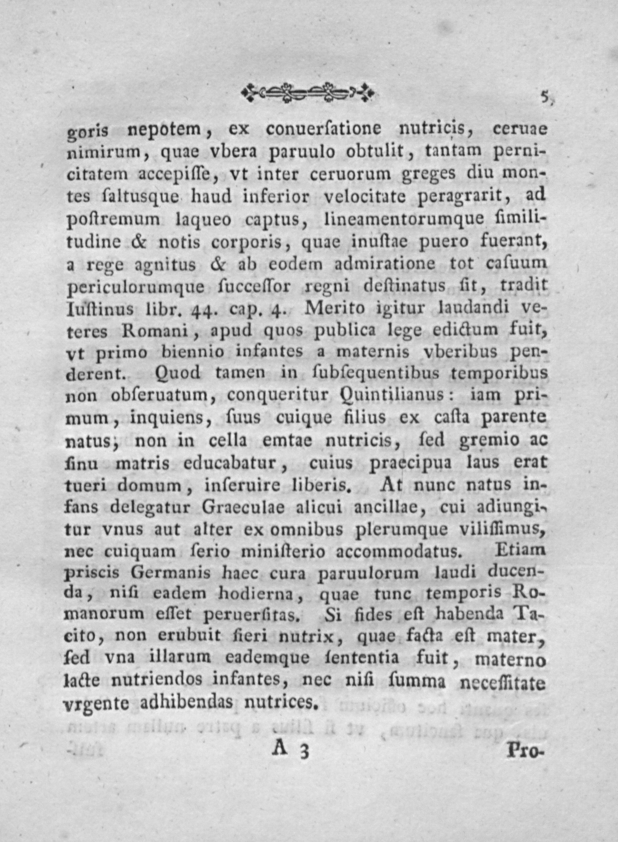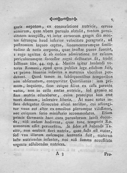 goris nepotem, ex conuerſatione nutricis, ceruae nimirum, quae vbera paruulo obtulit, tantam perni- citatem accepiſſe, vt inter ceruorum greges diu mon- tes ſaltusque haud inferior velocitate peragrarit, ad poſtremum laqueo captus, lineamentorumque fimili- tudine& notis corporis, quae inuſtae puero fuerant, a rege agnitus& ab eodem admiratione tot caſuum periculorumque ſucceſſor regni deſtinatus fit, tradit Iuſtinus libr. 44. cap. 4. Merito igitur laudandi ve- teres Romani, apud quœs publica lege edictum fuit, vt primo biennio infantes a maternis vberibus pen- derent. Quod tamen in ſubſequentibus temporibus non obſeruatum, conqueritur Quintilianus: iam pri- mum, inquiens, ſuus cuique filius ex caſta parente natus, non in cella emtae nutricis, ſed gremio ac finu matris educabatur, cuius praecipua laus erat tueri domum, inſeruire liberis. At nunc natus in- fans delegatur Graeculae alicui ancillae, cui adiungi- tur vnus aut atlter ex omnibus plerumque viliſſimus, nec cuiquam ſerio miniſterio accommodatus. Etiam priscis Germanis haec cura paruulorum laudi ducen- da, niſi eadem hodierna, quae tunc temporis Ro- manorum eſſet peruerſitas. Si fides eſt habenda Ta- cito, non erubuit ſieri nutrix, quae facta eſt mater, ſed vna illarum eademque fententia fuit, materno lacte nutriendos infantes, nec niſi ſumma neceſſitate vrgente adhibendas nutrices.