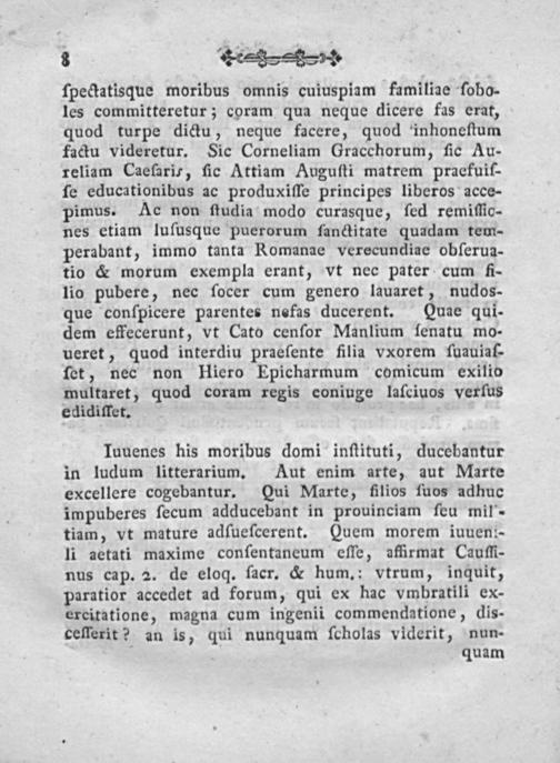 ſpectatisque moribus omnis cuiuspiam familiae ſobo- les committeretur; coram qua neque dicere fas erat, quod turpe dictu, neque facere, quod inhoneſtum factu videretur. Sic Corneliam Gracchorum, ſic Au- reliam Caefarir, ſic Attiam Auguſti matrem pracfuiſ- ſe educationibus ac produxiſſe principes liberos acce- pimus. Ac non ſtudia modo curasque, ſed remiſſio- nes etiam luſusque puerorum fancdtitate quadam tem- perabant, immo tanta Romanae verecundiae obſerua- tio& morum exempla erant, vt nec pater cum fi- lio pubere, nec ſocer cum genero lauaret, nudos- que conſpicere parentes nefas ducerent. Quae qui- dem effecerunt, vt Cato cenſor Manlium ſenatu mo- ueret, quod interdiu praeſente filia vxorem ſuauiaf- ſet, nec non Hiero Epicharmum comicum exilio