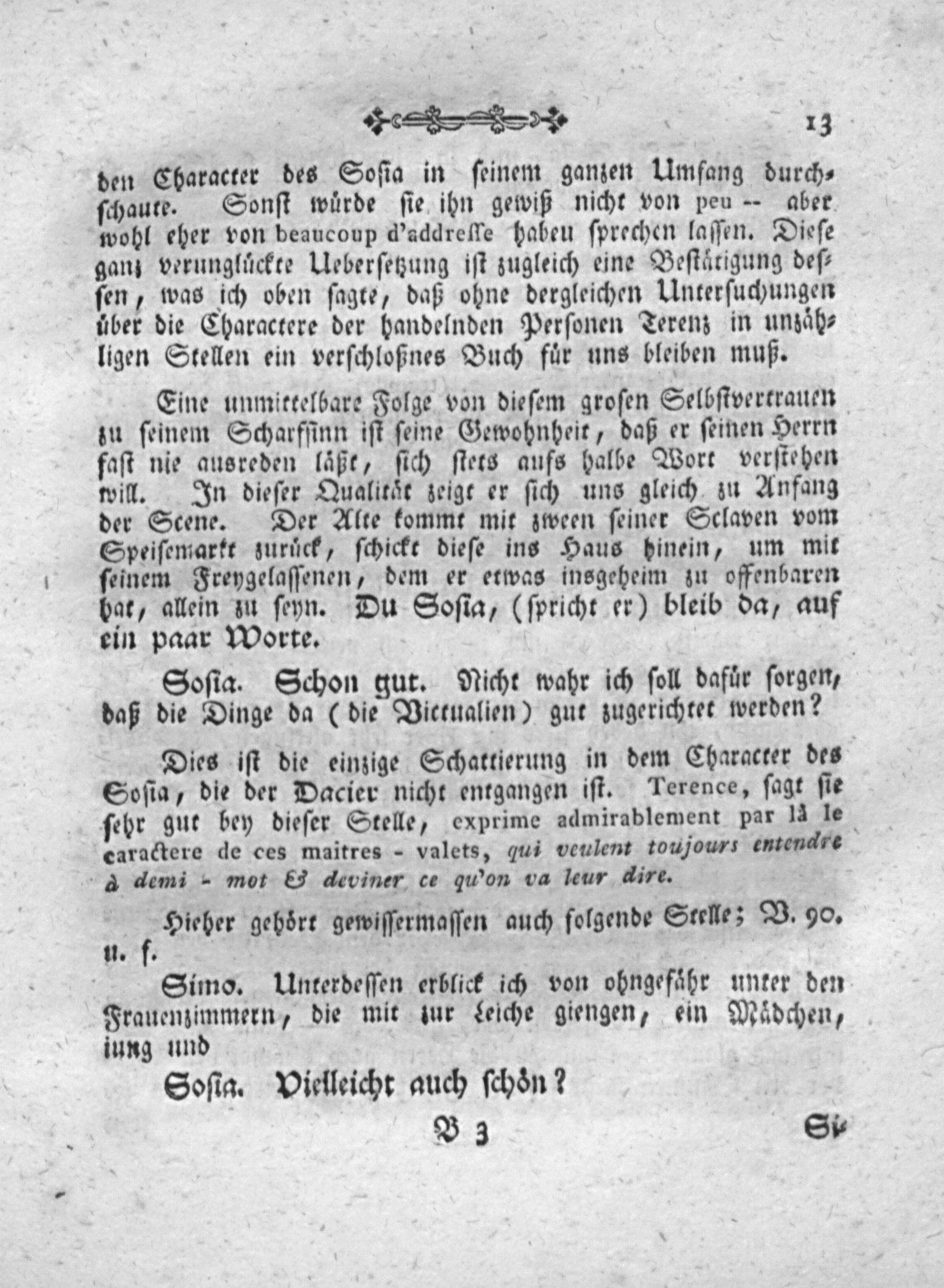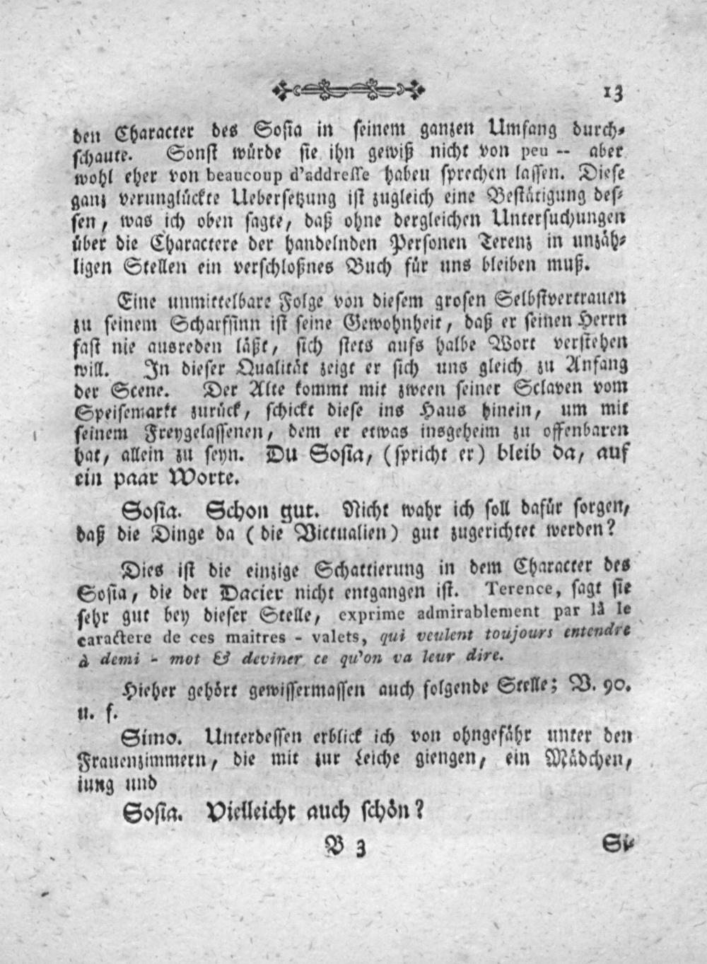 Eine unmittelbare Folge von dieſem groſen Selbſtvertrauen zu ſeinem Scharfſinn iſt ſeine Gewohnheit, daß er ſeinen Herrn faſt nie ausreden laͤßt, ſich ſtets aufs halbe Wort verſtehen will. In dieſer Qualitaͤt zeigt er ſich uns gleich zu Anfang der Scene. Der Alte kommt mit zween ſeiner Sclaven vom Speiſemarkt zuruͤck, ſchickt dieſe ins Haus hinein, um mit ſeinem Freygelaſſenen, dem er etwas insgeheim zu offenbaren bat, allein zu ſeyn. Du Soſia,(ſpricht er) bleib da, auf ein paar Worte.
