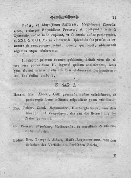 Inſtituetur primum examen pobheumz deinde vero die a1. tero hora pomeridiana II. ingenui quidam adoleſcentes, inter quos alumni primae claſis ipfi luas elaborarunt declamatiuncu- las, hoc ordins orabum,