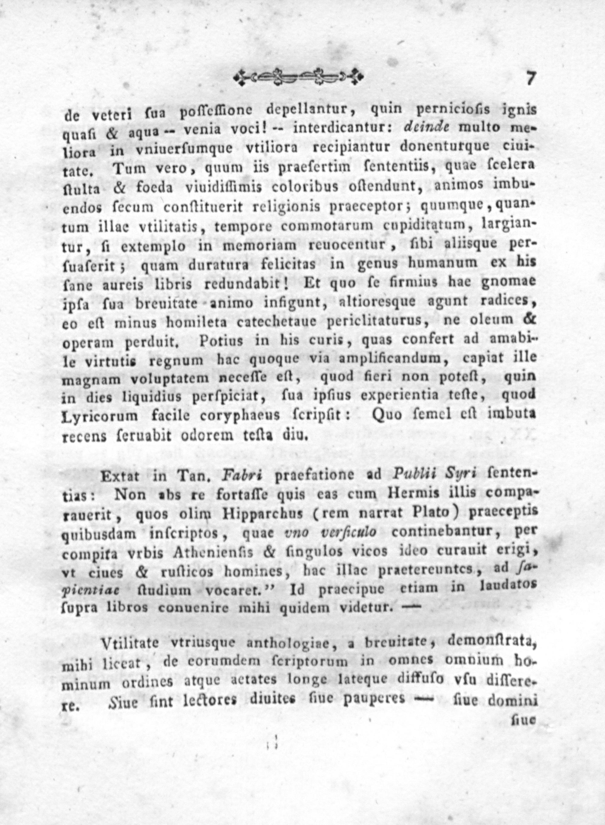 Extat in Tan. Fabri praefatione ad Publii Syri ſenten- tias: Non abs re fortaffe quis eas cum Hermis illis compa- rauerit, quos olim Hipparchus(rem narrat Plato) praeceptis quibusdam inſcriptos, quae vno verficulo continebantur, per compita vrbis Athenienfis& ſingulos vicos ideo curauit erigi, vt ciues& ruſticos homines, hac illac praetereuntes, ad fa- pientiae ſudium vocaret.“ 1d praecipue etiam in laudatos ſupra libros conuenire mihi quidem videtur.—