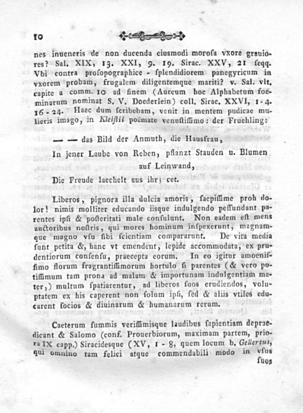 nes inueneris de non ducenda eiusmodi moroſa vxore grauio- res? Sal. XIX, 13. XXI, 9. 19. Sirac. XXV, 21 feqgq. Vbi contra proſopographice- ſplendidiorem panegyricum in vxorem probam, frugalem diligentemque mariti? v. Sal. vlt. capite a comm. 10 ad finem(Aureum hoc Alphabetum foe- minarum nominat§. V. Doederlein) coll. Sirac. XXVI, 1-4. 16-24 Haec dum ſcribebam, venit in mentem pudicae mu- lieris imago, in Kleiſtit poëmate venuſtiſfimo: der Fruehling: