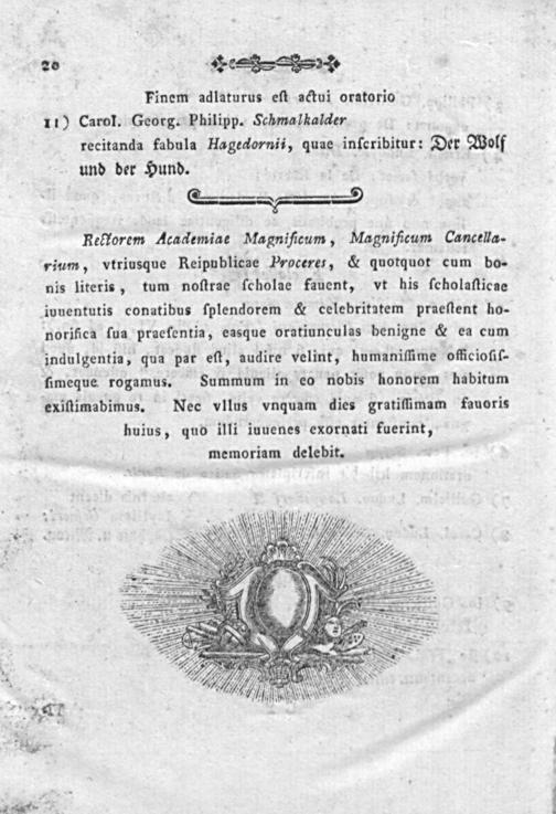 Finem adlaturus eſt actui oratorio 11) Carol. Georg. Philipp. Schmalkalder recitanda fabula Hagedornii, quae inſeribitur: Der Wolf und der Hund.